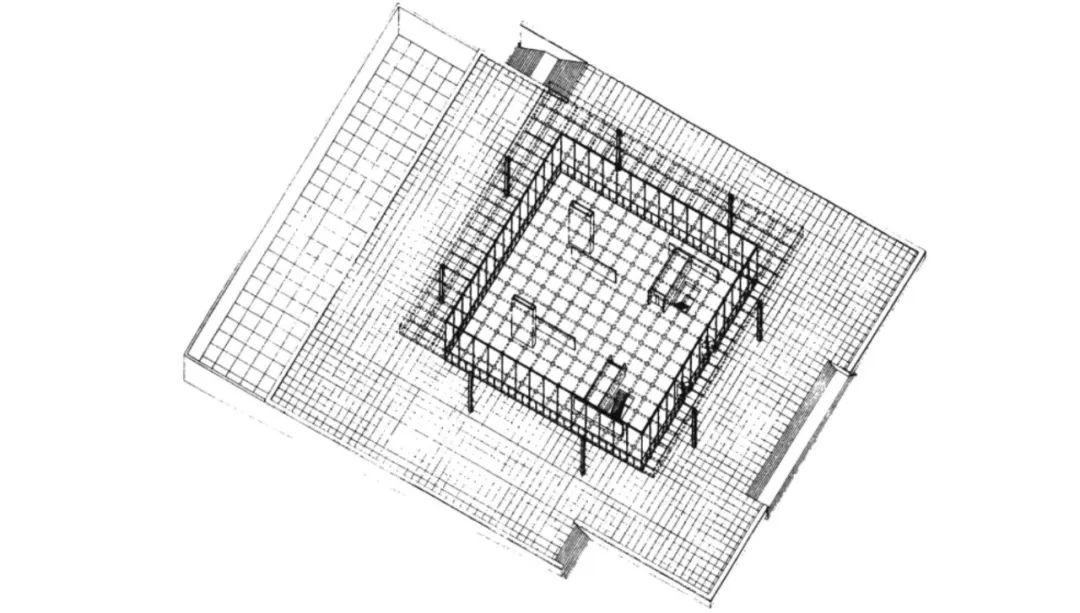 △ 德国馆中光井作为空间核心,其位置与水平镜像后的赖特罗比住宅中的壁炉一致