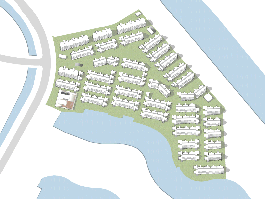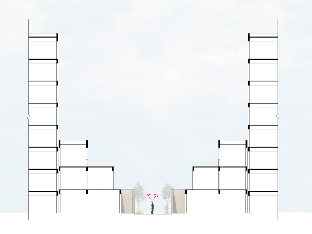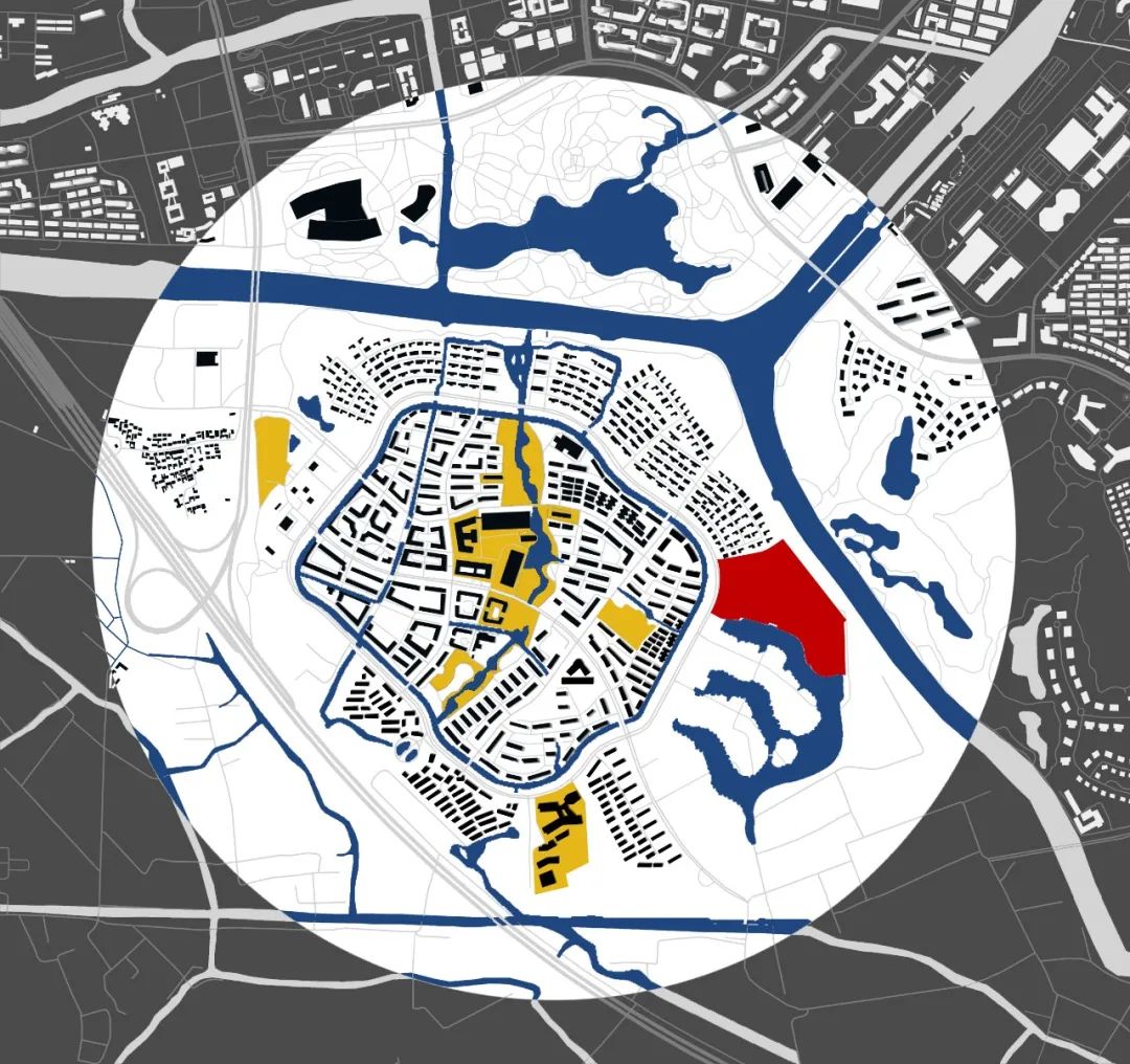 我们从用地开始进行研究,梳理边界条件与间距控制的原则后,发现一个有趣的现象:当整块地不满足高品质合院产品的情况下,根据限高边界可将用地分为两块,容积率降低带给设计以更多的可能性,也为空间关系留有余裕,最终形成涵盖合院、叠拼、洋房的组团式集约化规划布局形态。