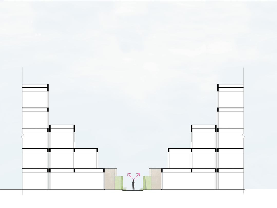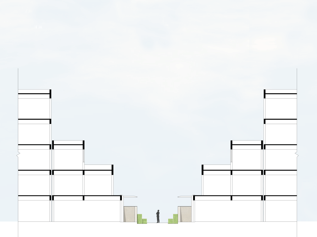 我们针对性的研究过3米、4.8米、5.5米等各种尺度街巷的感受,最终以人视角度为标准选择了更为适宜的尺度,形成了从社区入口大门-组团门头-街巷空间-入户门头的连续性且具有层次感的空间体验,希望所形成的物质空间形态对社区环境可以起到积极的作用。