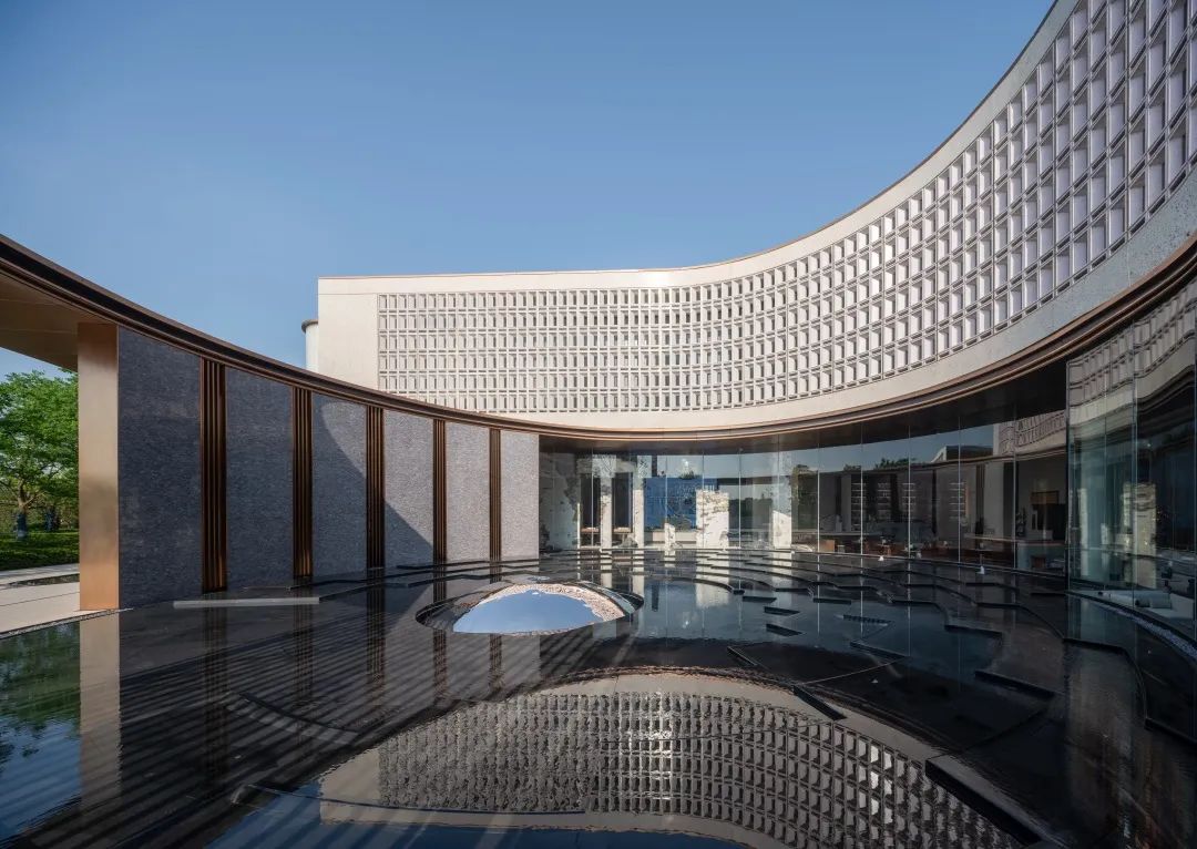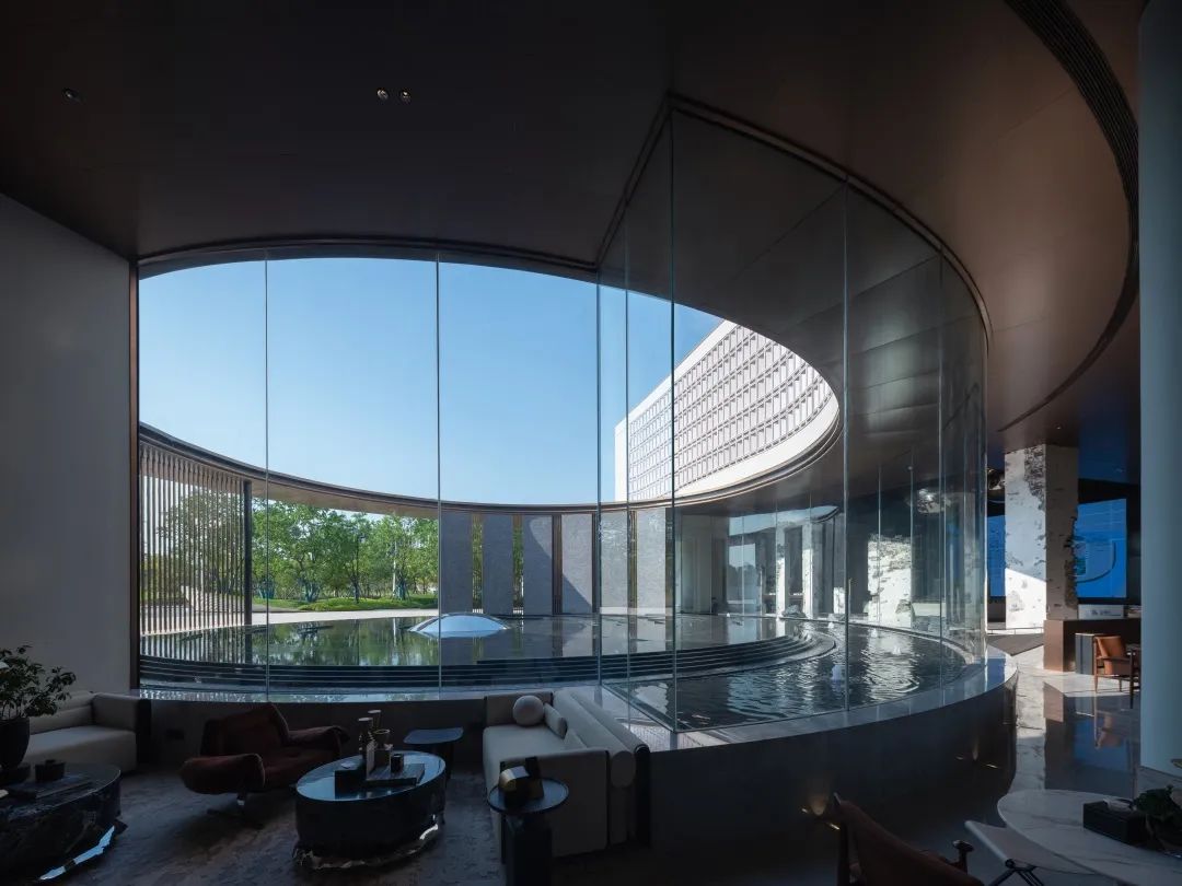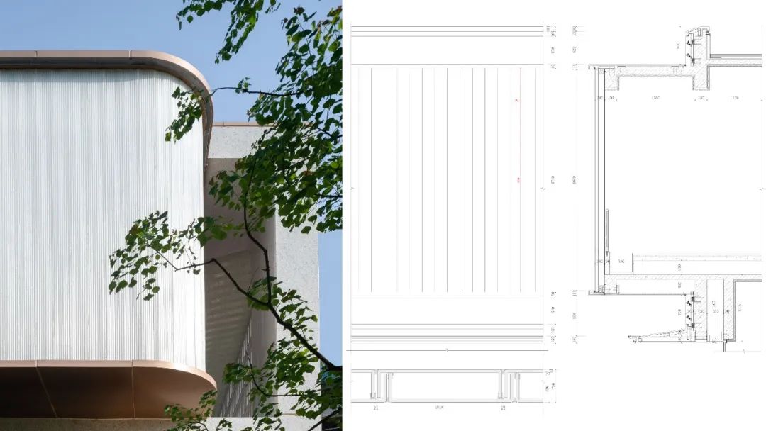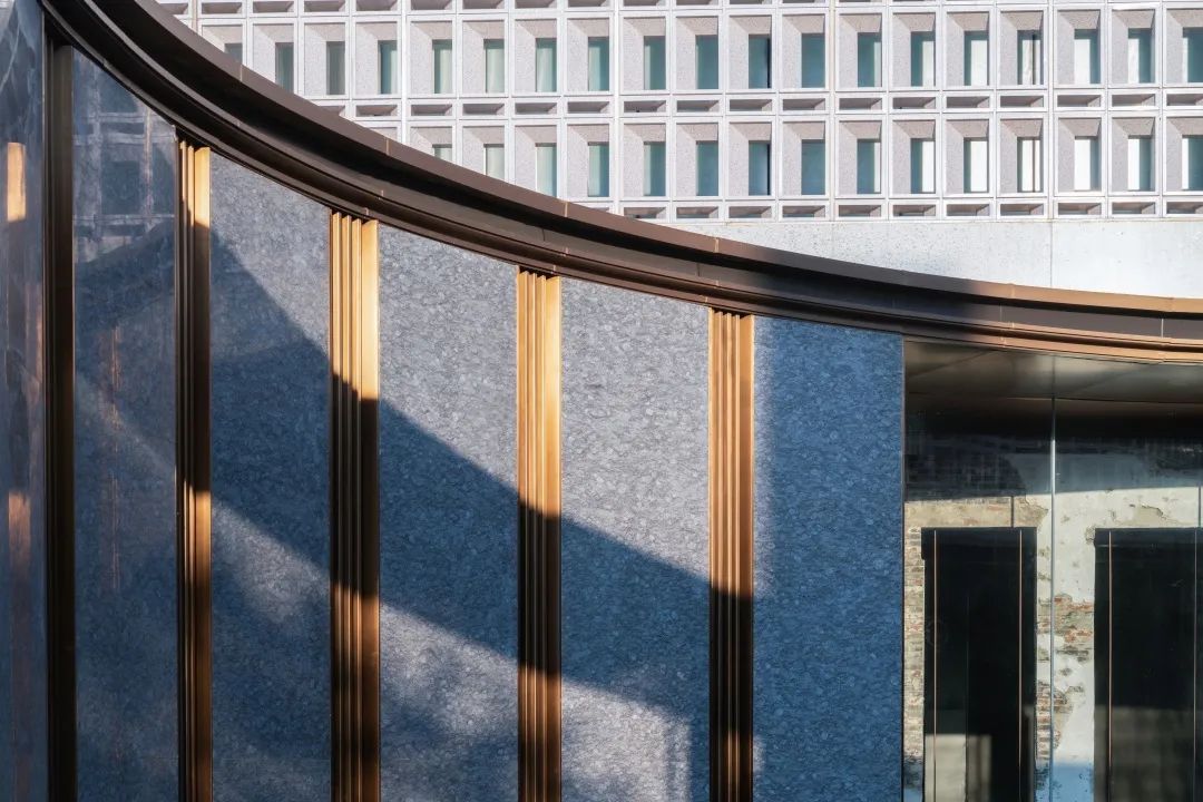 与首层极致的通透玻璃形成对比,放眼到整体则形成了建筑的透明到不透明的渐变,使得空间获得了新的质感与张力。