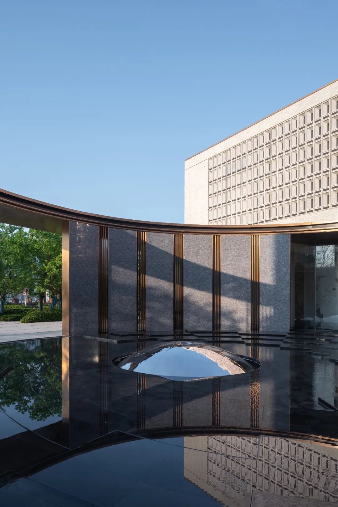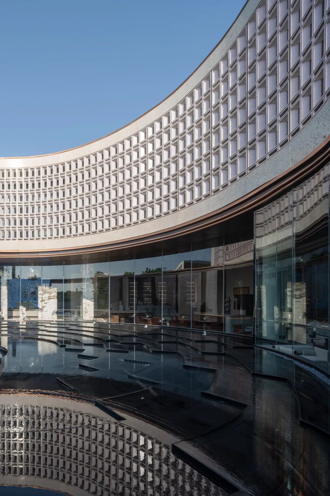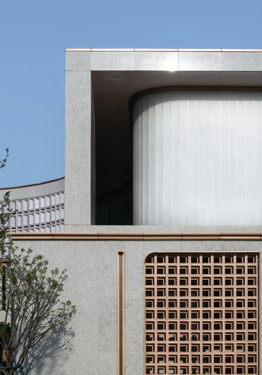 与首层极致的通透玻璃形成对比,放眼到整体则形成了建筑的透明到不透明的渐变,使得空间获得了新的质感与张力。