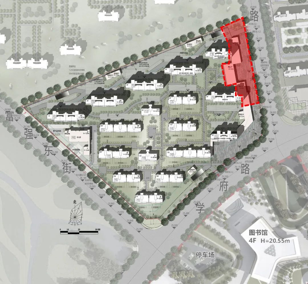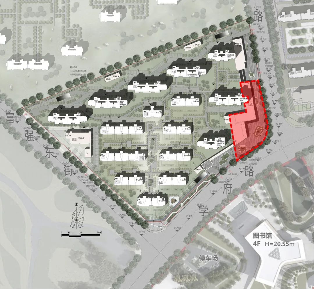 为了更好的回应周边的文体资源,示范区最终选择东南角。借势提炼图书馆形体的设计元素,并重新梳理线性美学的关系,按照黄金分割线比例重新建构。