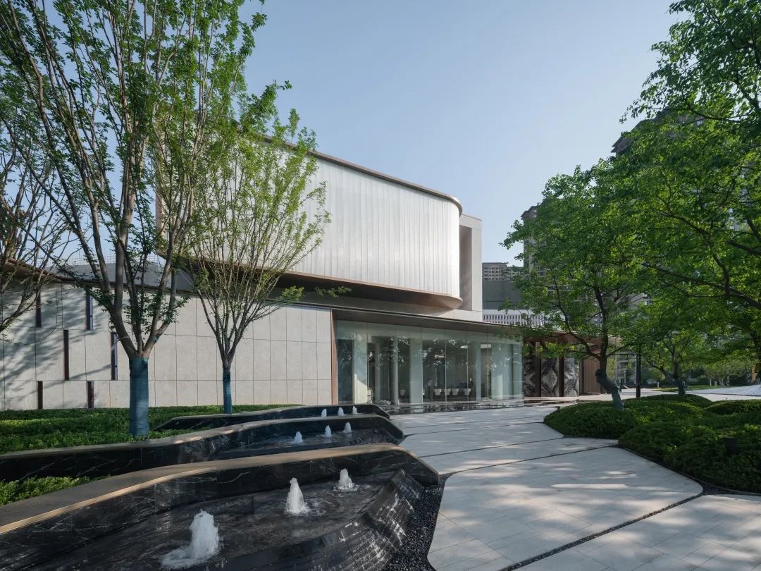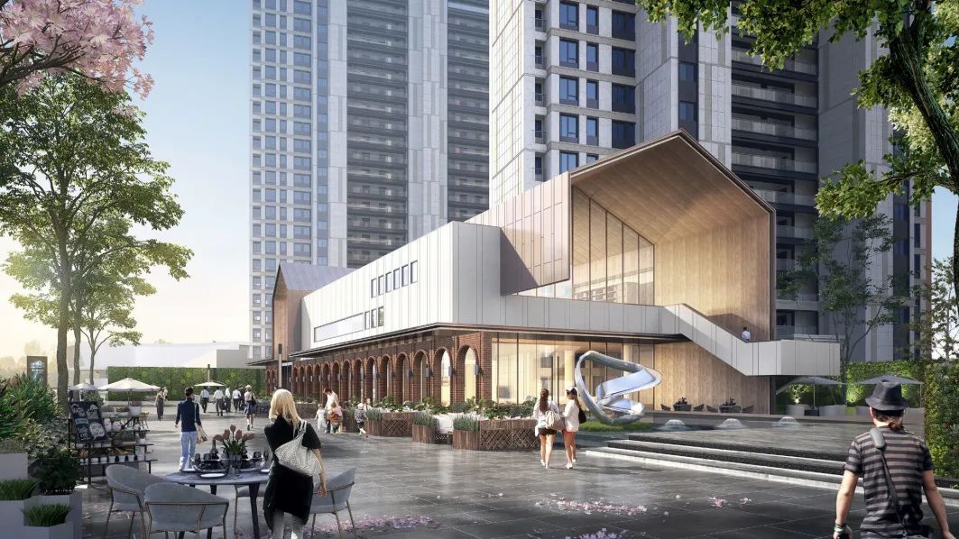 示范区形体与城市图书馆相呼应,二层悬挑又可与图书馆进行视线对话,在浅米色统一的基调之下,形成完整连续的城市界面。