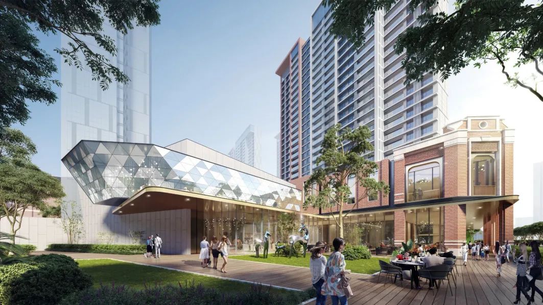 坐落在街角的示范区从街道向后退让,在宜人尺度下植入公共空间,又与周边文体资源联动形成有序、有度的城市级公共空间,使其与周围环境更好地交融,循着空间印记,为人们提供可驻足、交流的多重公共场域。
