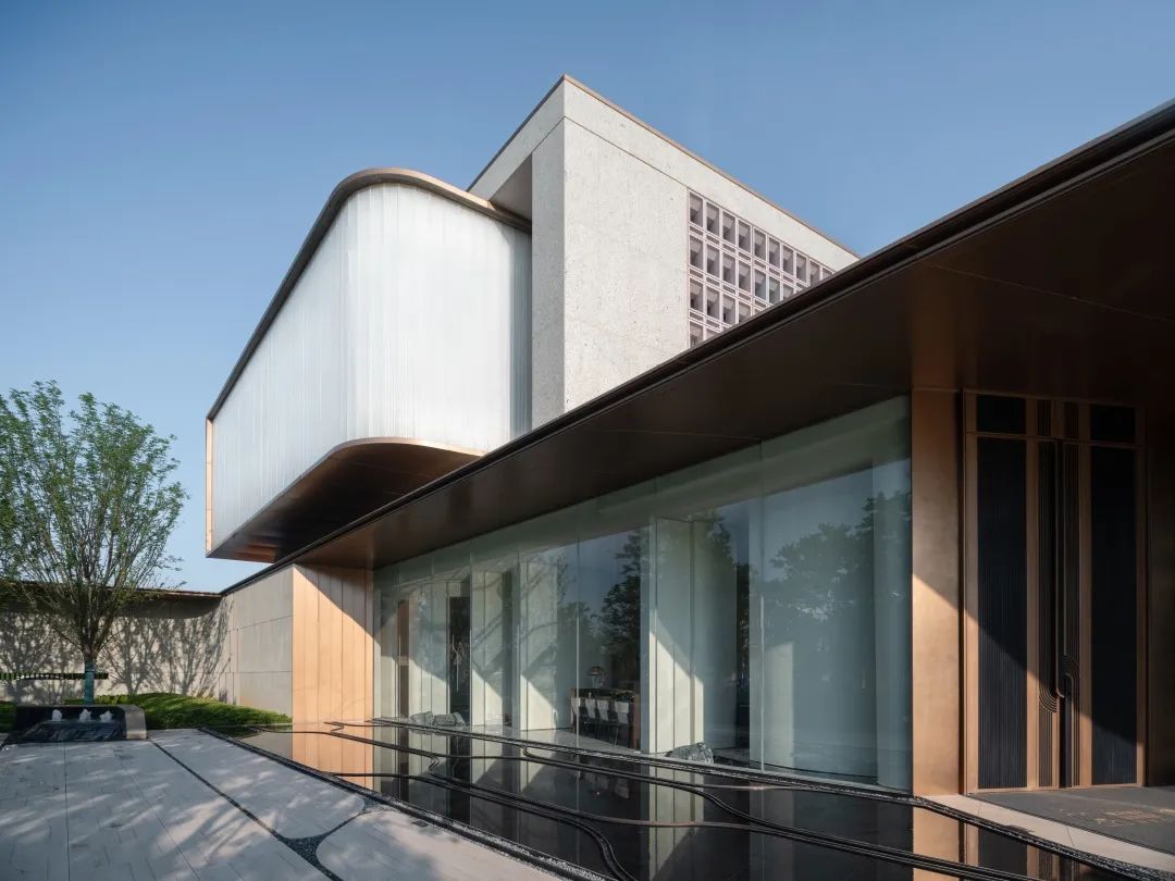 为了保持室内的私密性,同时能够产生柔和的光线漫射效果,示范区二层主立面,大面积使用了透光不透视的U型玻璃,外为条幅状,内为平滑面的呈现形式,既能满足功能需求又环保节能。