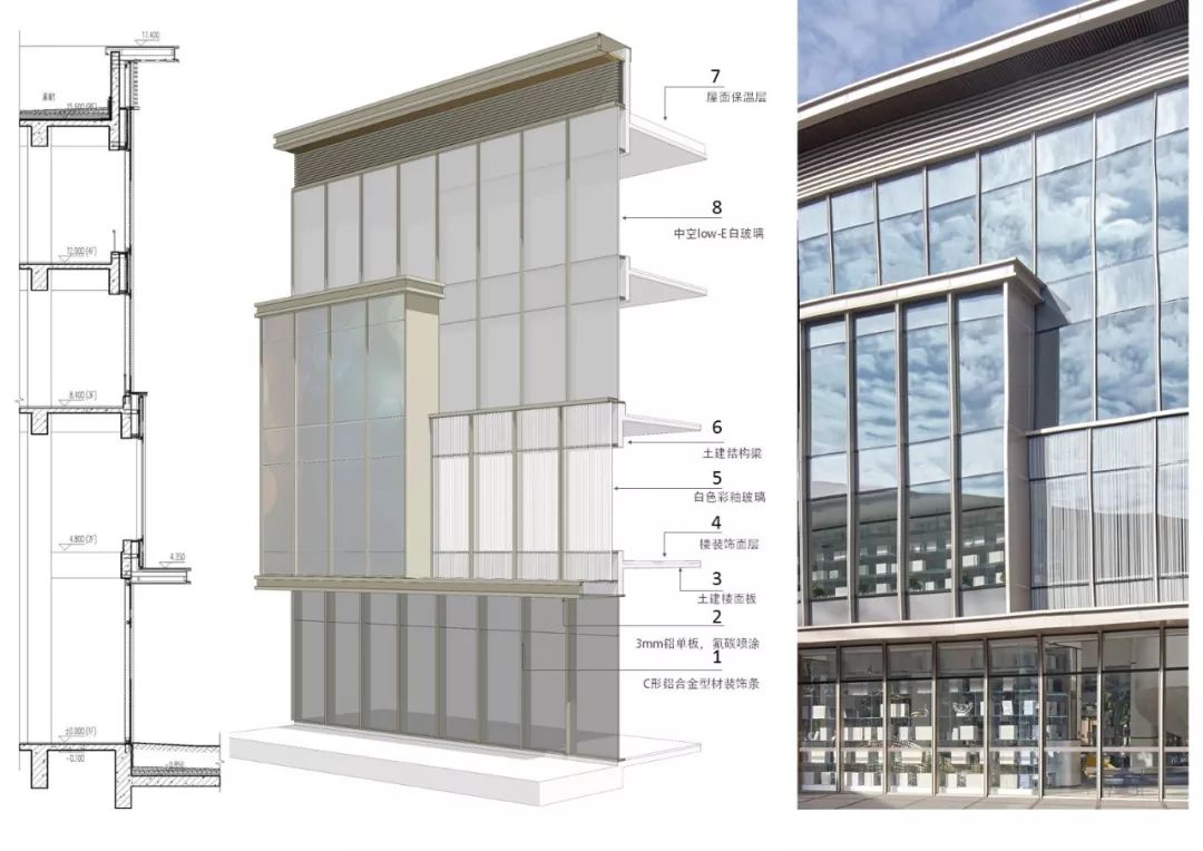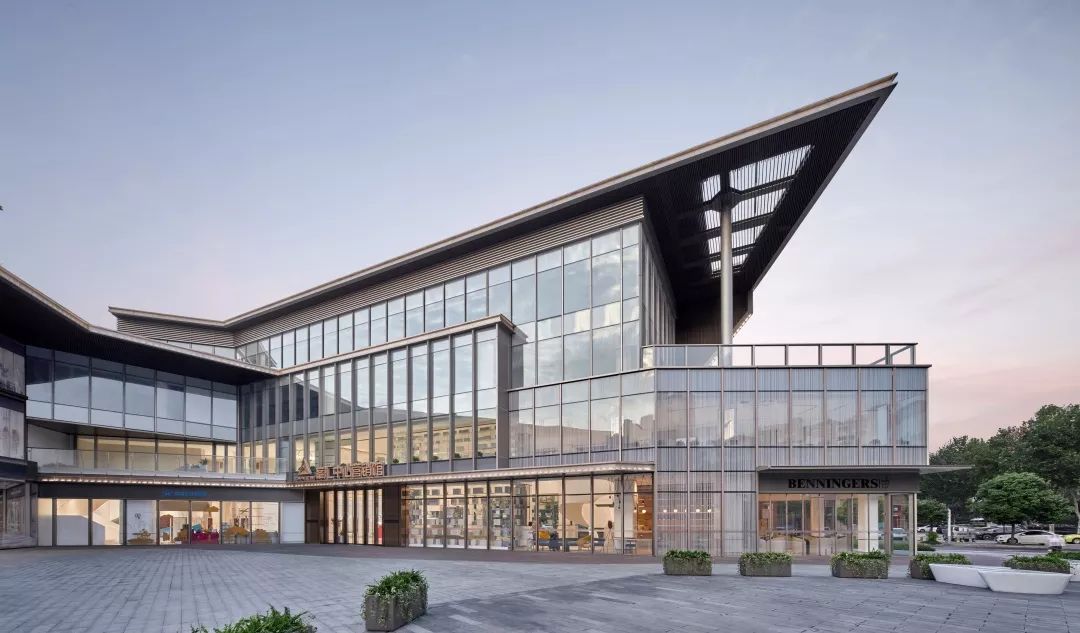 在外立面材质的设计上,设计师采用简洁模数化玻璃幕墙体系结合香槟金色的金属铝板,与周边住区的素雅形成鲜明的对比,增强商业中心的视觉感受。深度研究彩釉玻璃样式尺度 ,通过玻璃的反射与折射,映衬和谐开放街区,又与周边环境遥相呼应。