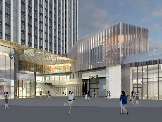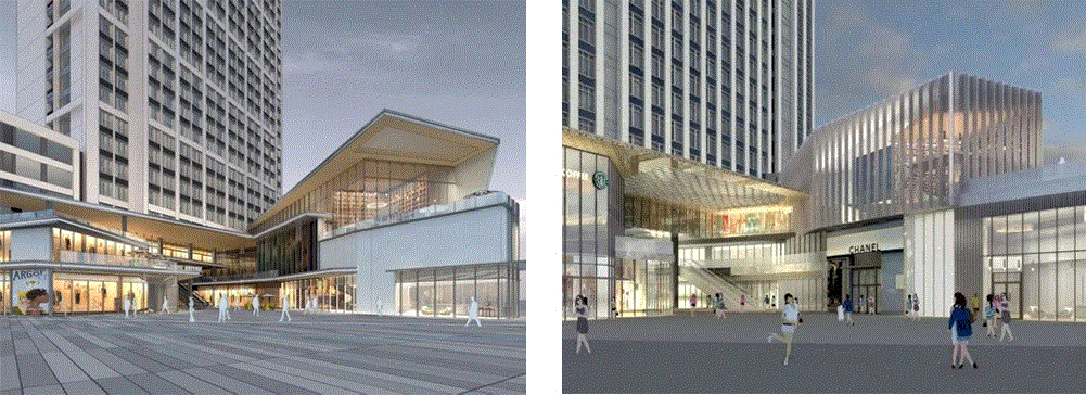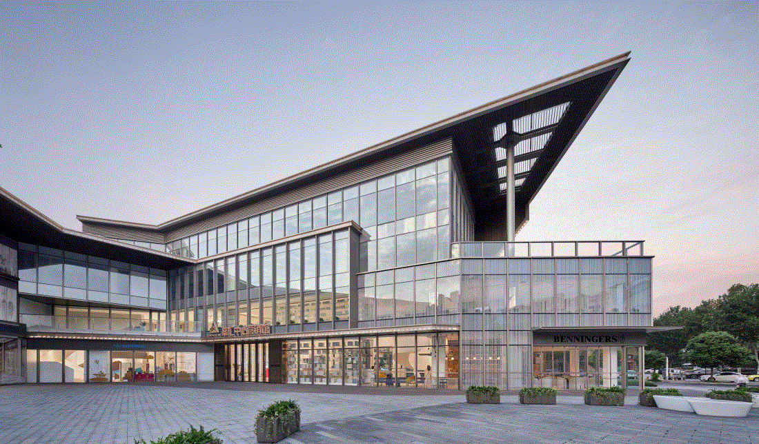 夸张的挑檐延伸城市天际线,采用色彩丰富的铝合金材质与玻璃幕墙,营造商业氛围感及丰富度,强化商业街区的入口形象。