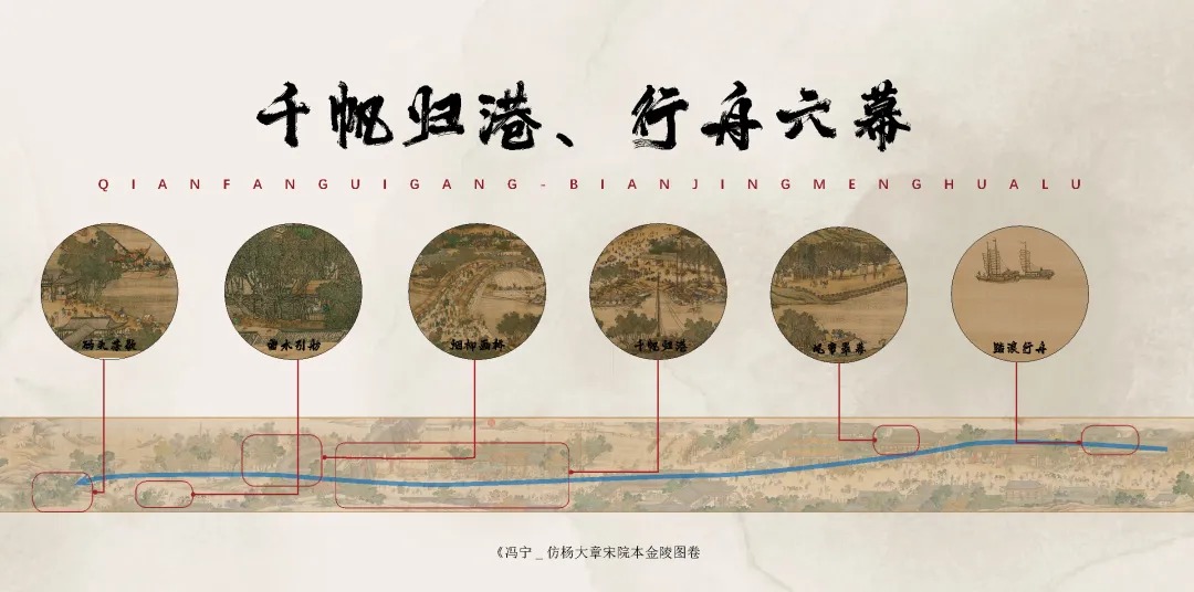《仿杨大章画<宋院本金陵图〉》中生动描绘了宋代金陵城的人文生活场景,我们的院落构思也源由于此,将空间划分为"行舟踏浪"、“风幕翠幕”、"码头茶歇"、”烟柳画桥”、“曲水引舫”“扁舟唱晚”六大情境,以宁静文雅的诗意空间传递东方美学深意。