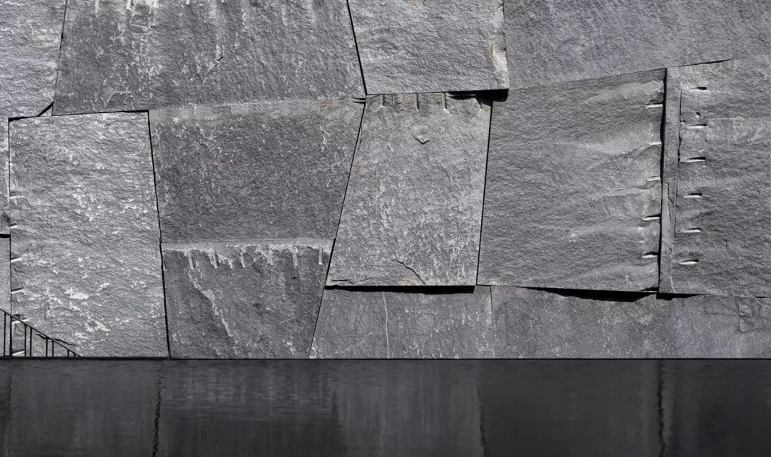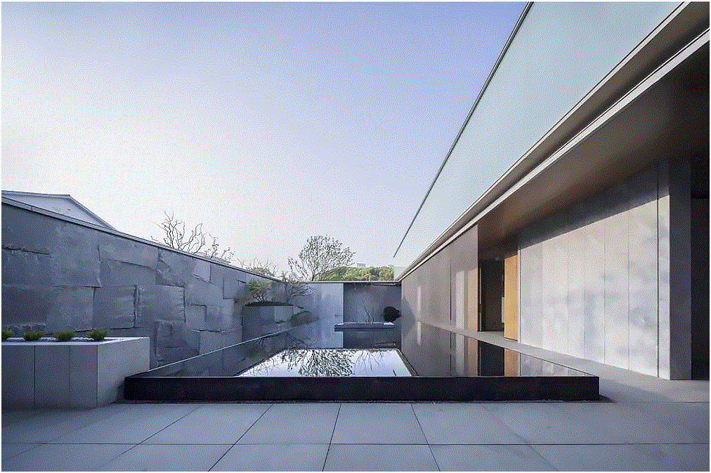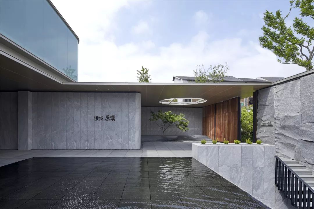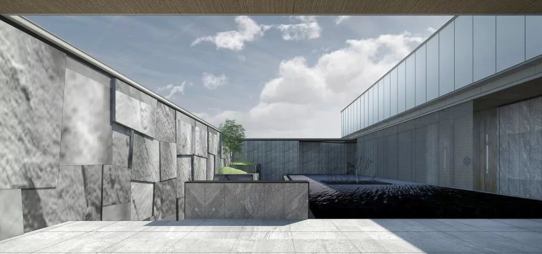为使示范区建筑朝向城市的视觉效益最大化,弥补因占地小可能带来的体量感不足,致逸设计团队对基地一侧的停车场立面进行改造借用,使其在视觉上错位成为案内建筑主体的一部分,并利用石材竖向肌理、中央水景的镜面反射从纵向扩展建筑的视觉形象。