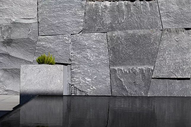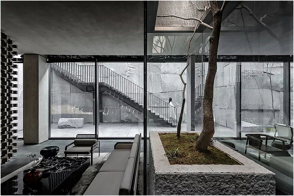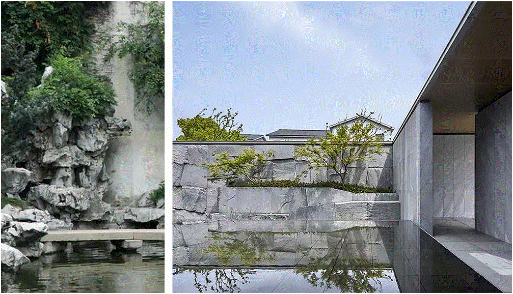 ◎(左)苏州园林山石;设计师最着力之处之一是对下沉庭院石屏的处理,千岩竞秀满足对山的想象,使观者得复返自然之境。