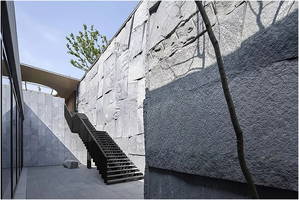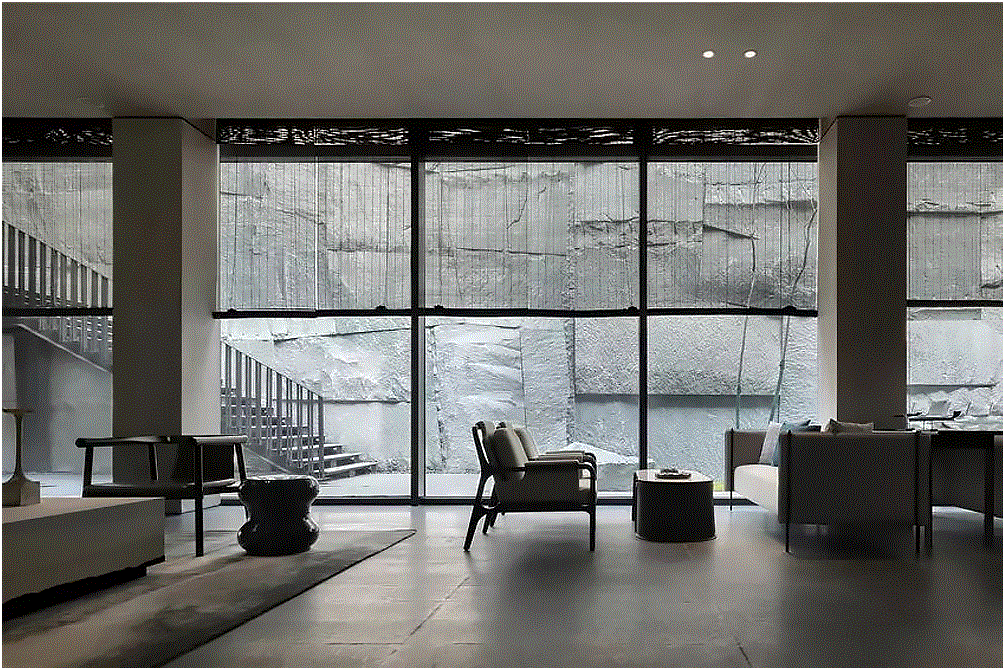 ◎从室内往外的视野亦能感受石屏所呈现的峥嵘质感。