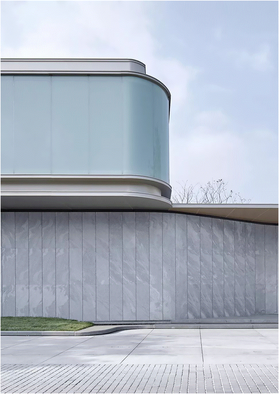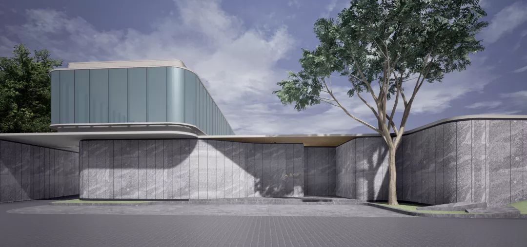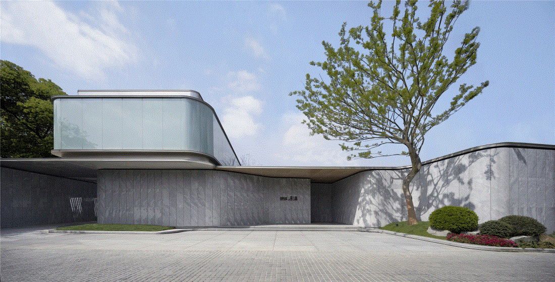 “合于天造,厌于人意”,从宋代汝窑展现的美学中获得启发,示范区入口处建筑在材质选择上删繁就简,采用新西兰麻灰石岩作为建筑立面主体材质,大面积夹胶玻璃则取其趋近汝窑净润青雅的色彩意象;建筑立面的曲面处理,是在直线中求得曲线,这与宋代美学的极致抽象线条的提炼方法同出一辙。与此同时,通过材质与线条将建筑、景观、室内三者融合一体,以此模糊室内外空间的界限,促使空间感向更大的向度延伸。