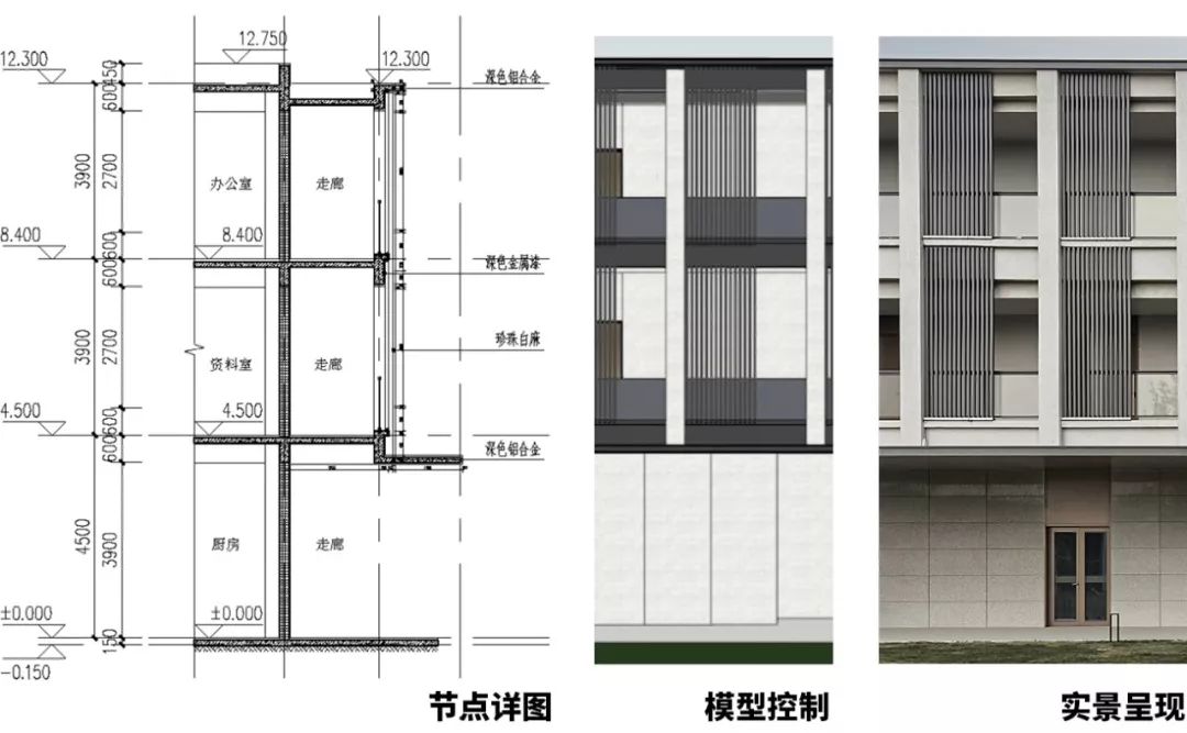 建筑主体由两个部分构成,上部的体量采用石材,厚重典雅;下部的体量采用金属,轻盈精致。两者在空间、比例、尺度上完美组合,形成重与轻、实与虚的对比。