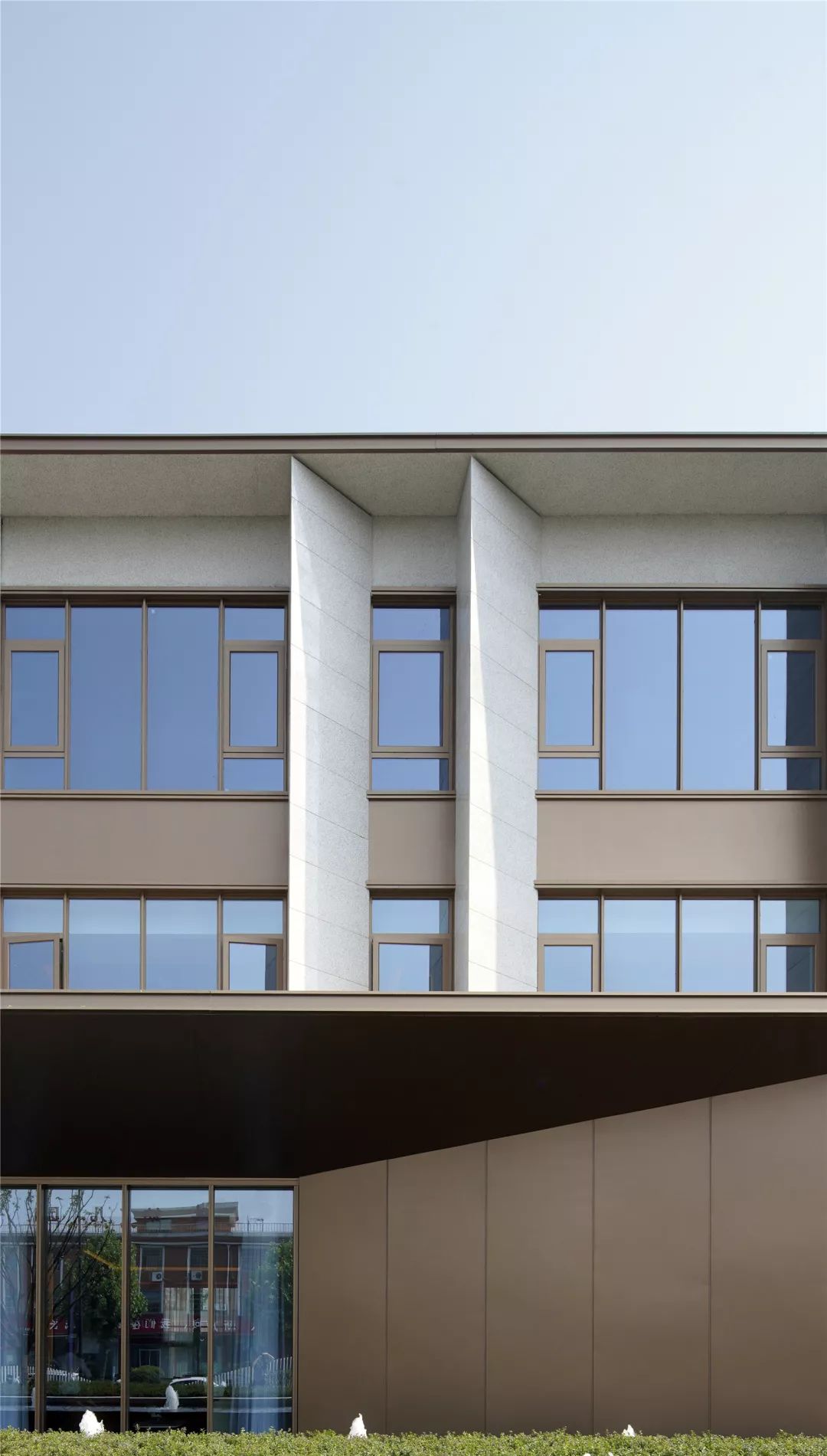 幼儿园建筑不允许使用玻璃幕墙系统,设计从Foster Partners设计的Bloombergs European HQ得到灵感,使用铝合金装饰表皮,近人尺度营造丰富感、体验感和尊贵感。
