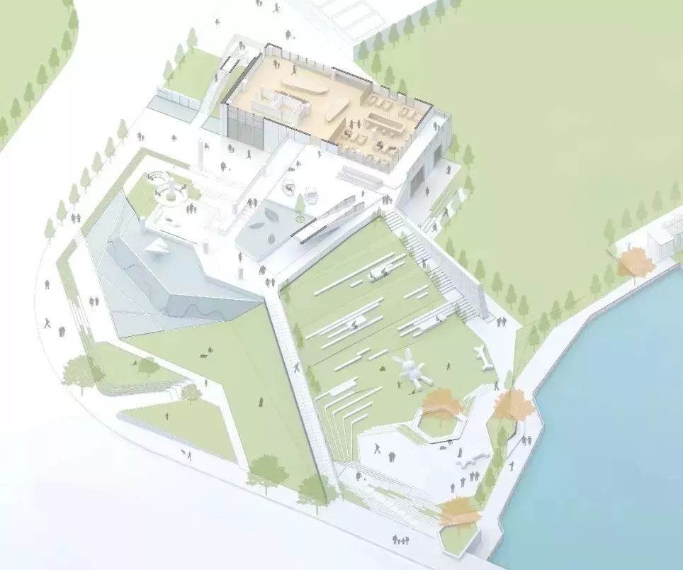 除了在选址上颇费心思,建筑与环境关系的和谐共存也是设计师思考的重点。保留原有的滨湖公园风貌,塑造连续的、开放的、自然的展示界面,来界定内外的空间场所,L型走向、折叠与向外延伸的建筑造型就由此而产生。