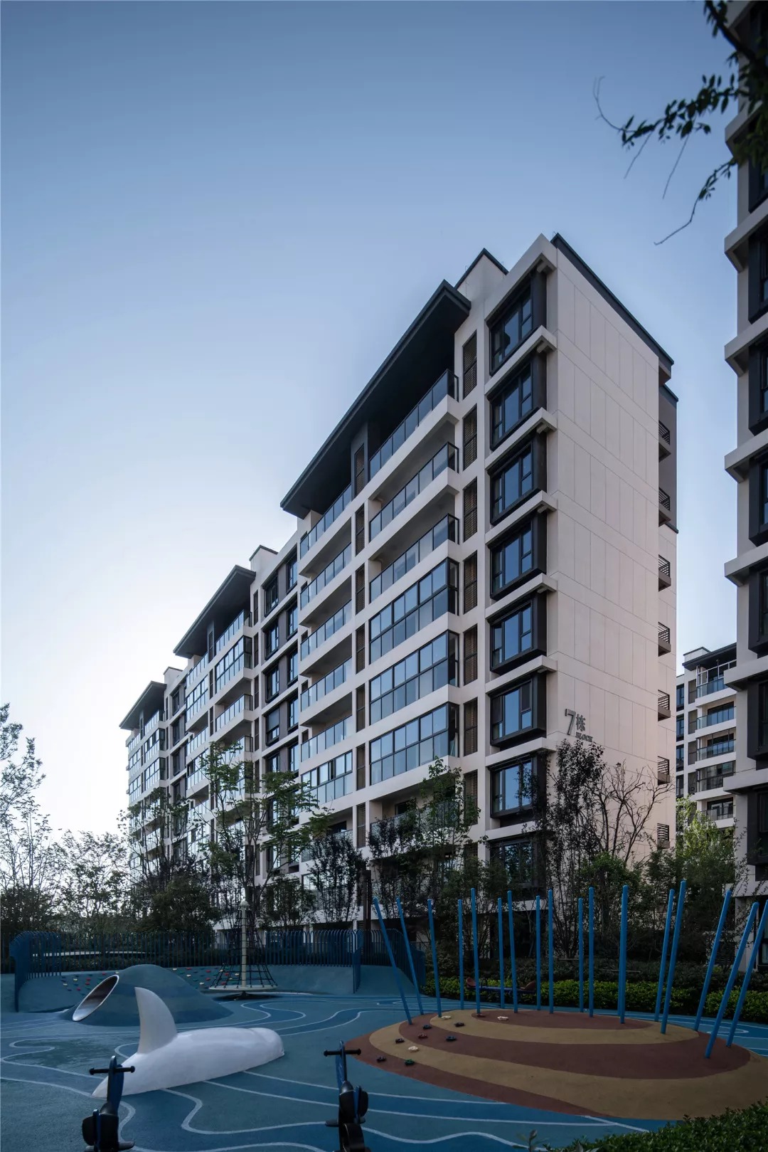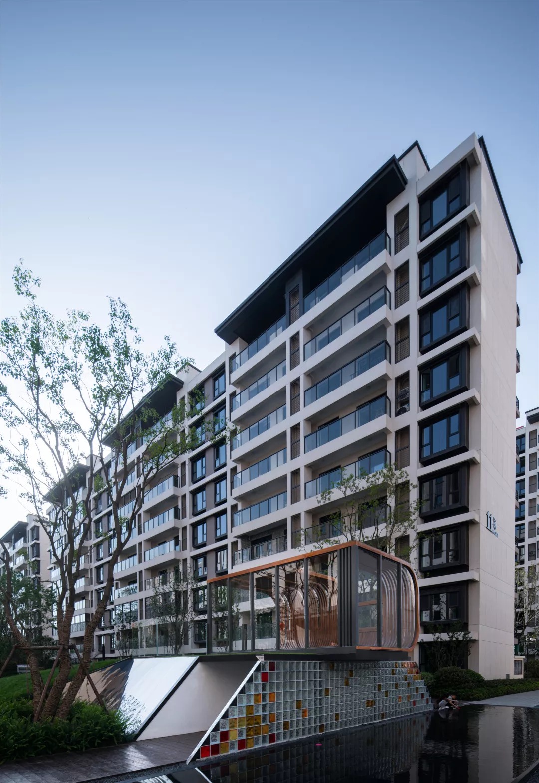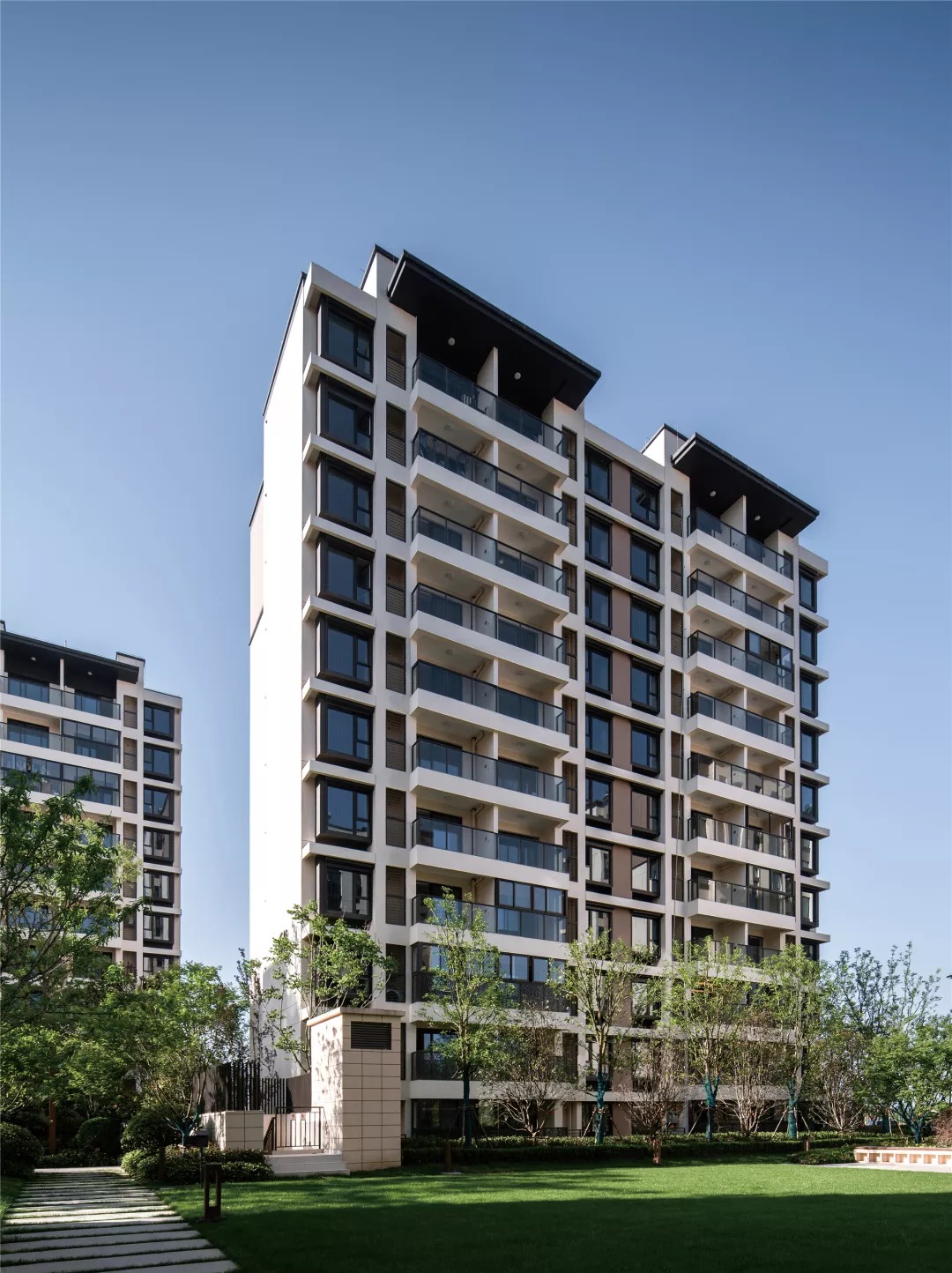建筑的造型设计现代优雅、简洁明快,在休闲度假风格和传统中式风格之间平衡,形成新苏式立面风格。