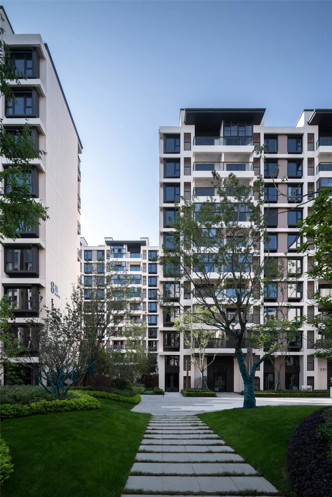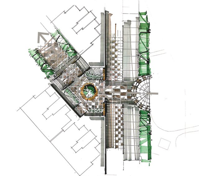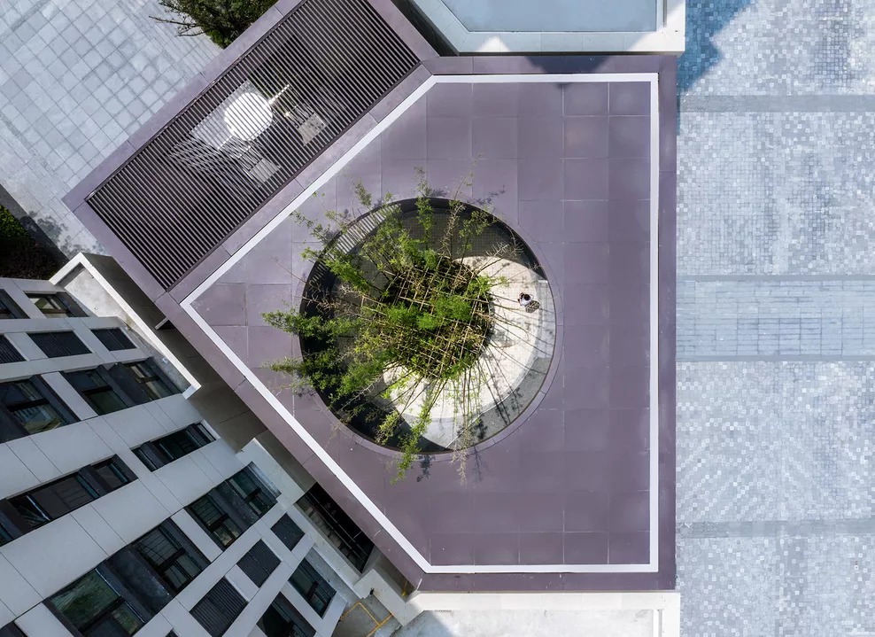 通过起承转合的空间变化,形成从城市公共空间到私密居住空间的转化,柔化内部景观轴线和城市界面之间的锐角的矛盾。