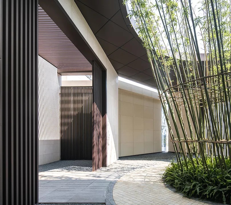 由于建筑和地块北侧边线成斜角布置,入口节点空间重点雕刻。借鉴江南园林的空间处理方法,欲扬先抑、层层递进;通过建筑、景墙绿化的结合,以小见大,营造富有江南园林特色的空间。