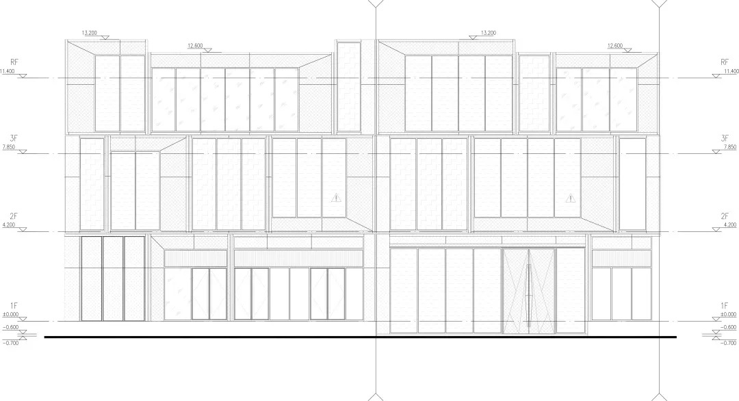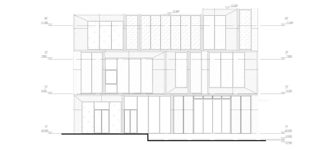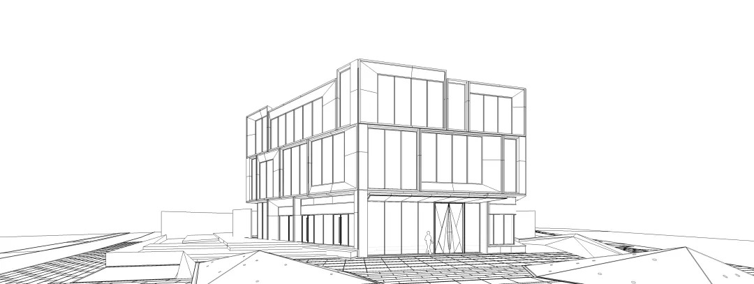 通过对规整统一的“城市橱窗”进行错落拼接,形成了丰富的公共城市界面。采用形体切割,使建筑墙面与顶部折线式的造型界面错落有致,丰富视觉的同时强调了建筑的雕塑感。