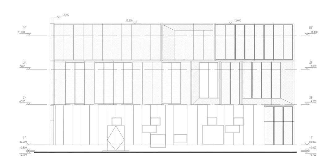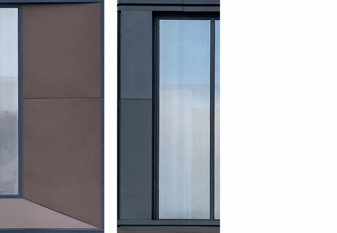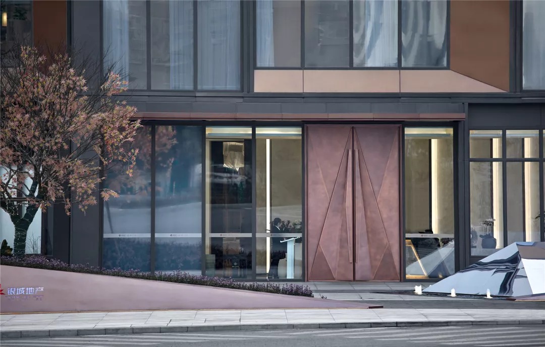 立面以铝板和玻璃这两种材料为主。细节上,铝板采用两种状态,灰色铝板和铜色铝板,灰色用于立面铝板框和部分铝板面,铜色用于雨棚和凹凸铝板面;玻璃亦使用了两种形态,高反玻璃和印花玻璃,力图使整个建筑现代而不花哨,素雅而不刻板。