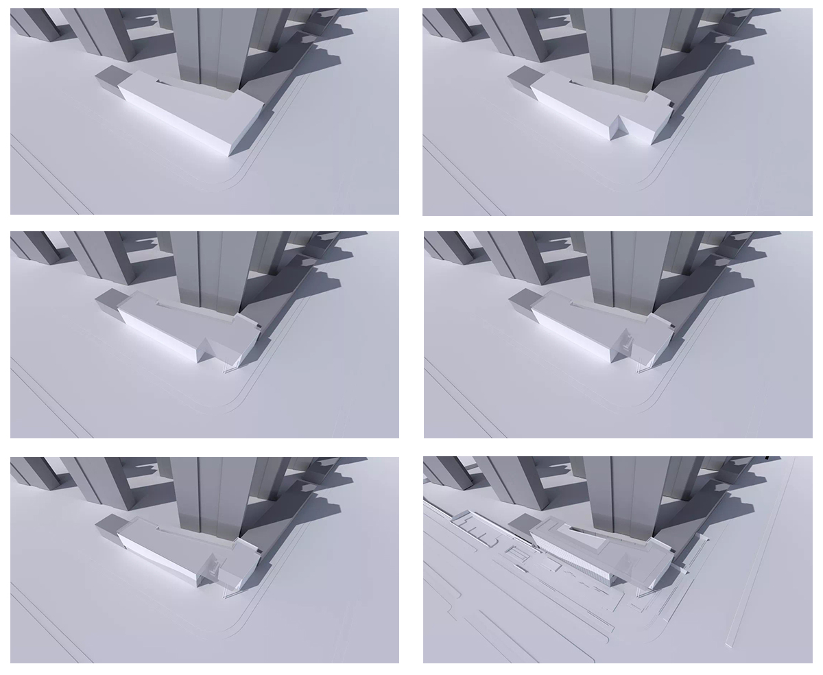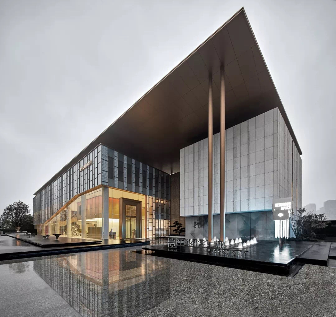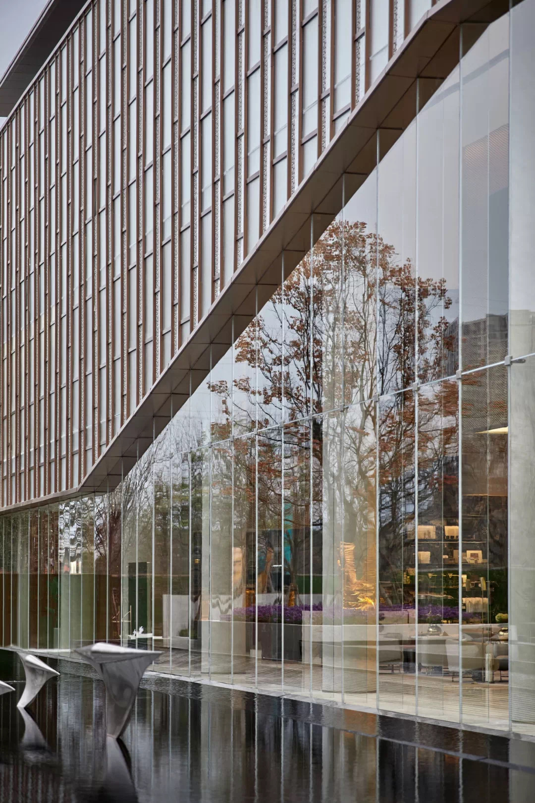 不同于内向围合建筑空间的常规做法,我们将内部空间感投射在外,外部场景同时映射其中;浑厚凝重的石材与通透的玻璃质感形成对比,产生戏剧的冲突之美;规整挺拔的建筑界面朝城市敞开,为城市生活植入新元素,激活片区的活力氛围。