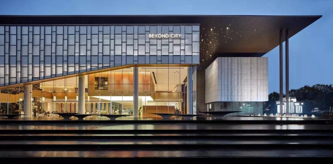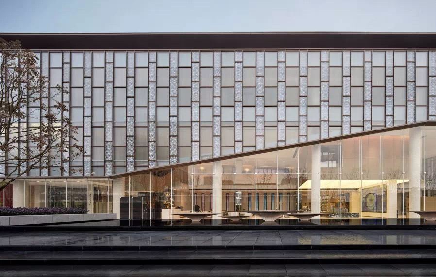 立面材质的选择也颇为大胆:超白高透玻璃的基础上,结合彩釉玻璃和半透明波纹花式玻璃,肌理质感分外惹人注目。华灯初上,建筑内部透出温润的光晕,经由不同材质的渲染烘托,富于优雅的艺术气韵。