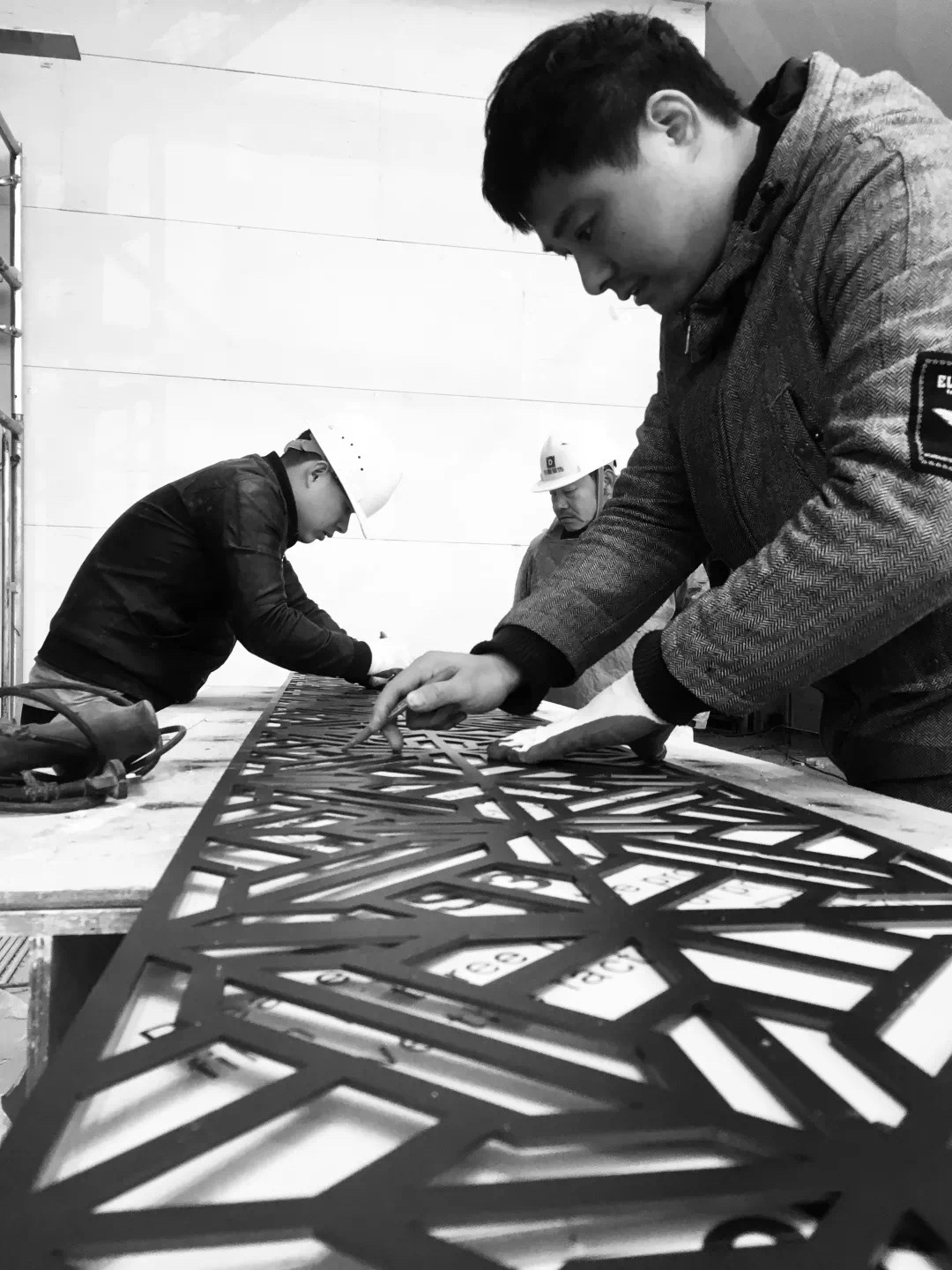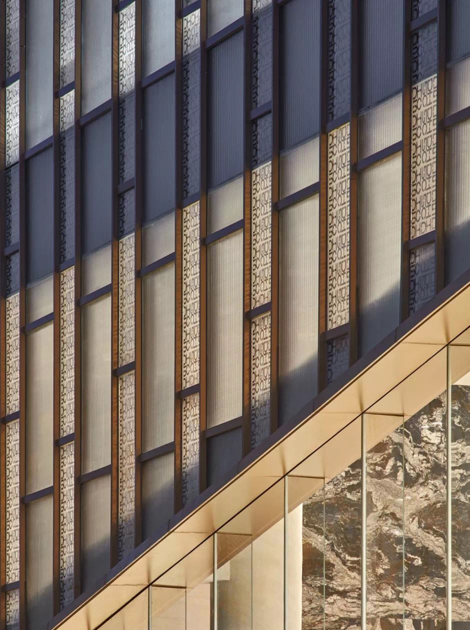 而在玻璃纹理的细部构造中,我们将案名字母的图案进行再创造,通过多轮比选与反复调试,最终实现雕塑感与艺术感兼具的整体效果。