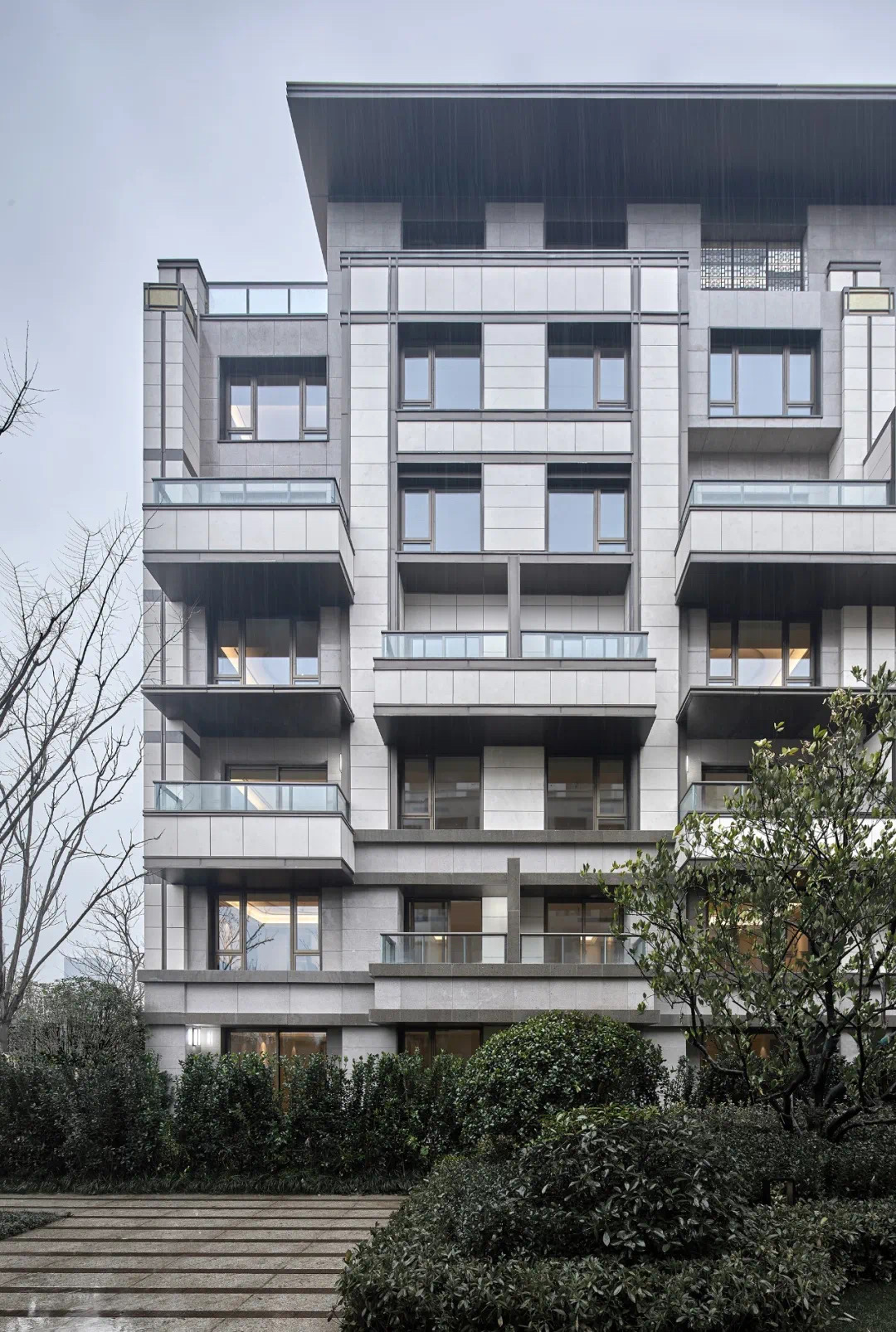洋房外立面为全石材干挂幕墙,选用米黄色石材与深褐色石材错缝拼接,层次丰富、色彩柔和,精细妥帖的的细节展现低调的奢华与优雅。