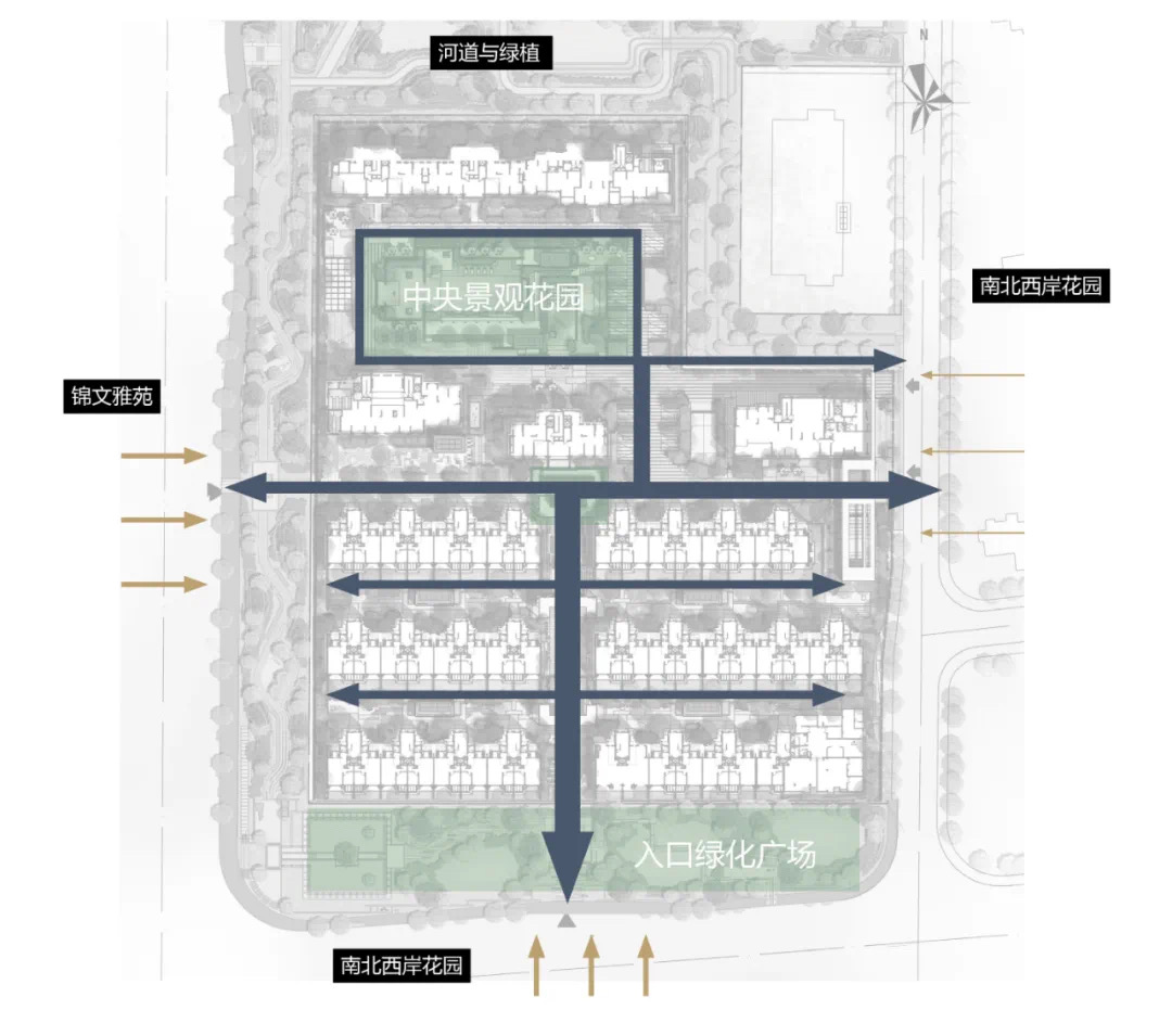 总体布局以近人尺度的中央绿轴作为分割边界,呈现从南向跃层洋房到北侧高层住区的态势,错落的城市天际线形成层次丰富的人居社区,展现“意致东方、情致现代”的生活氛围。