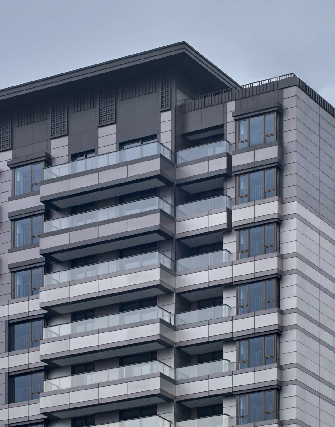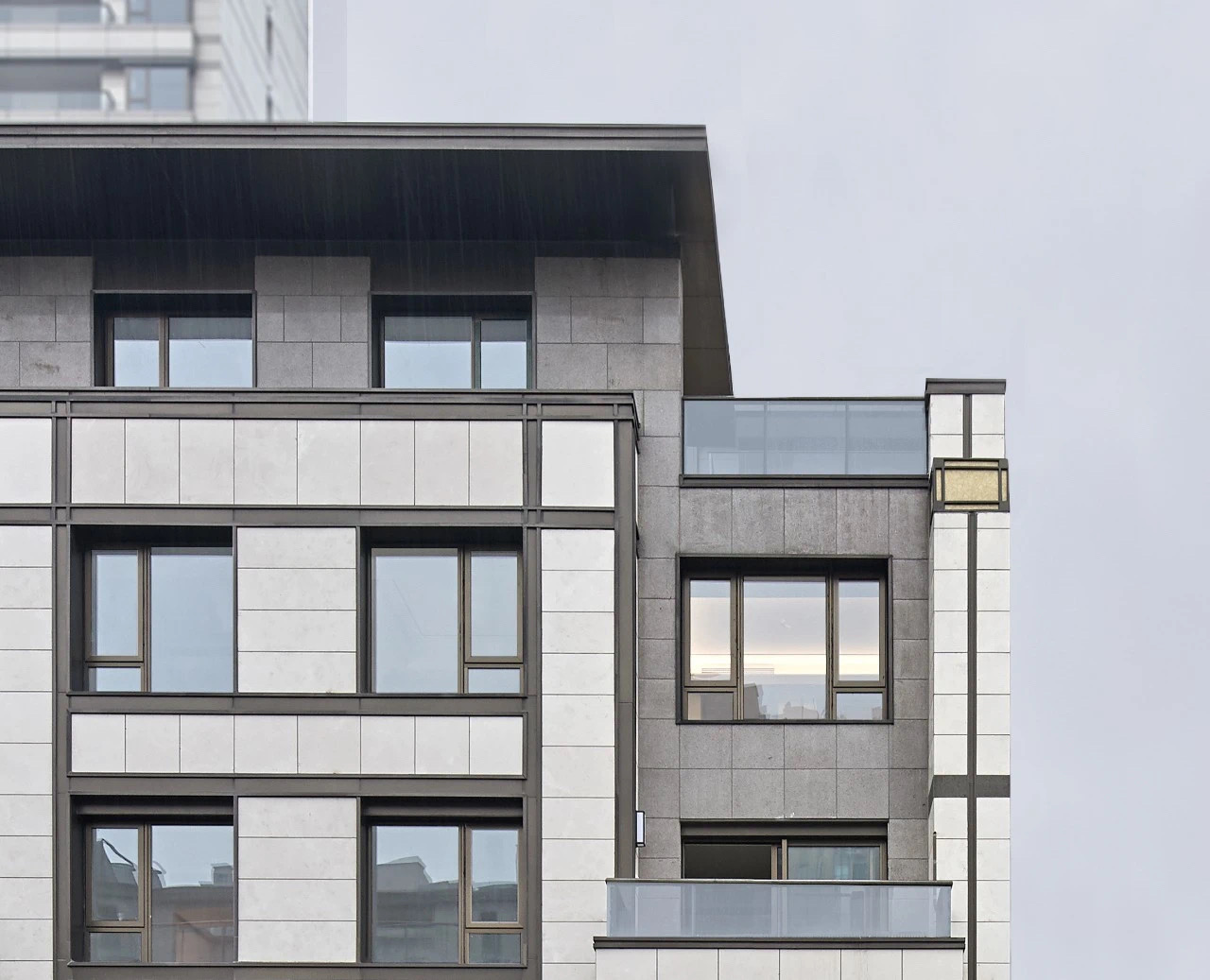 高层住宅外立面设计与选材上寻求细腻感,基座全石材干挂幕墙与主体铝板干挂幕墙的结合,彰显简约挺拔的现代审美。不同颗粒质感的铝板拼贴,在呼应洋房立面风格的同时,形成了细腻生动、富于变化的建筑表情。