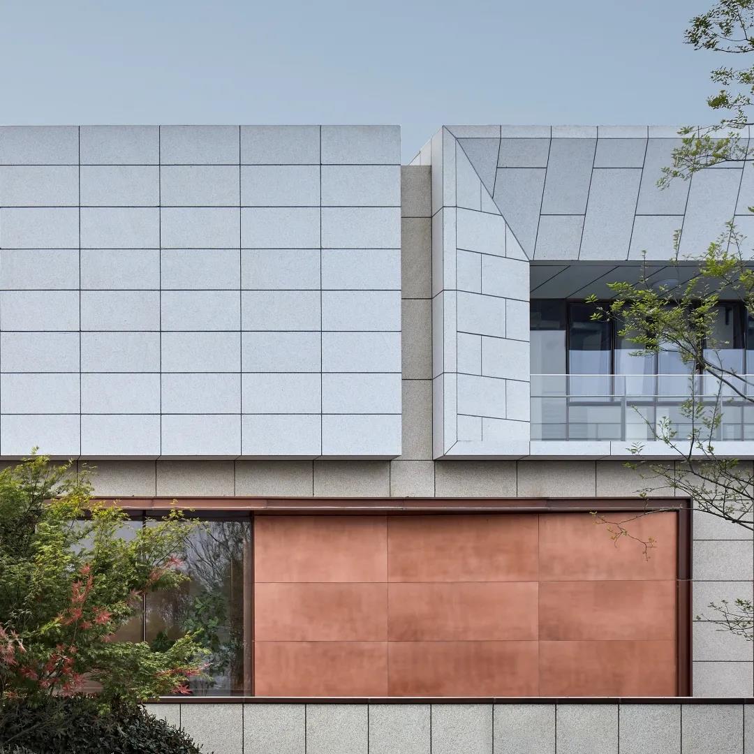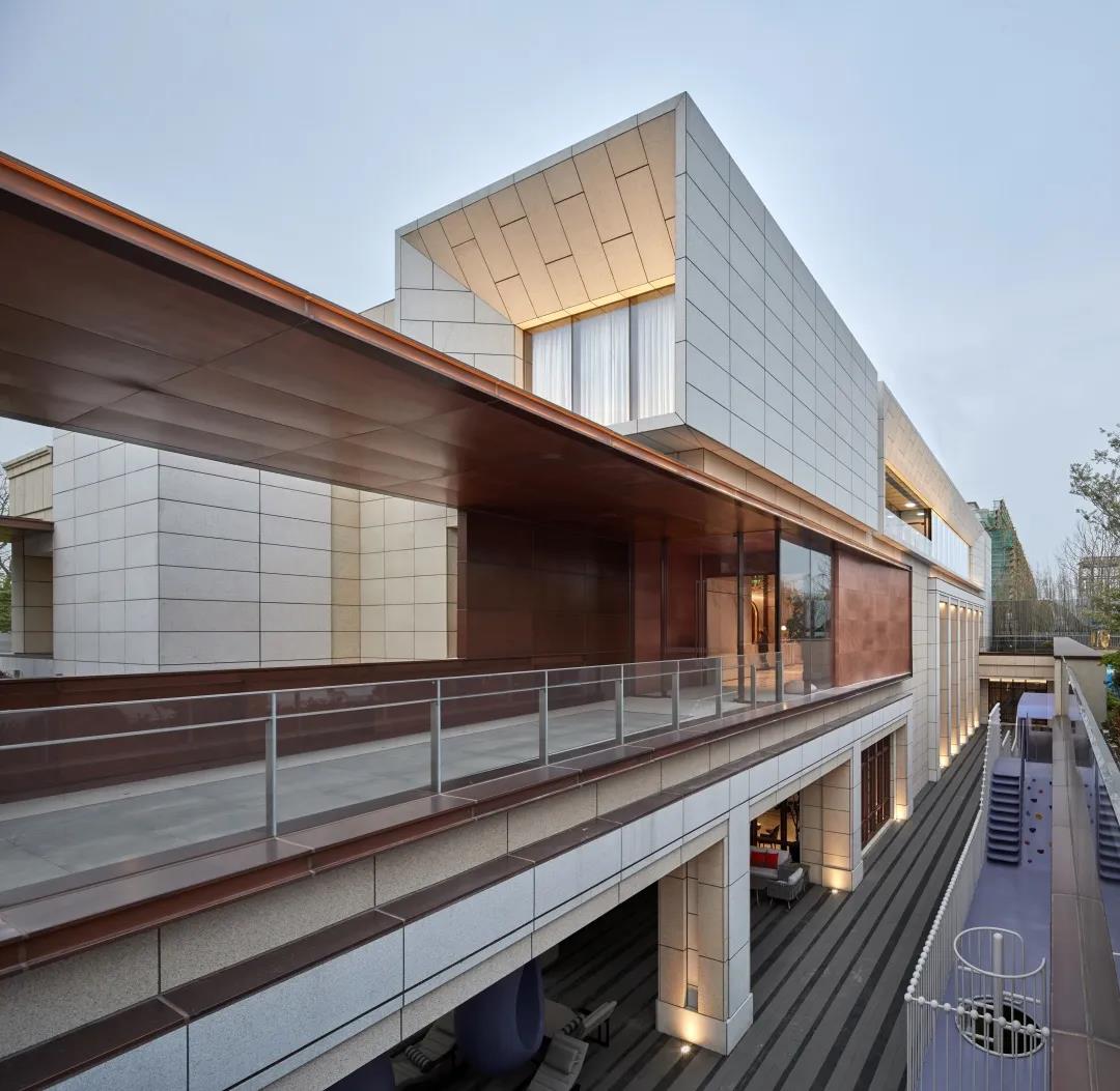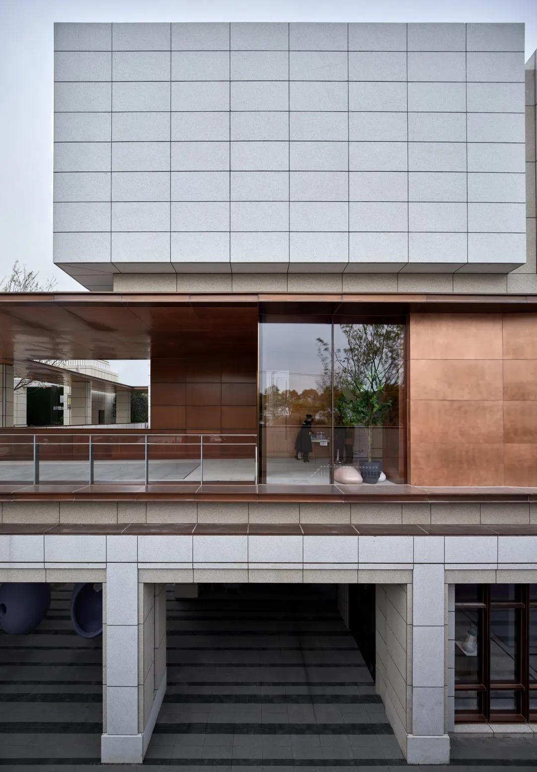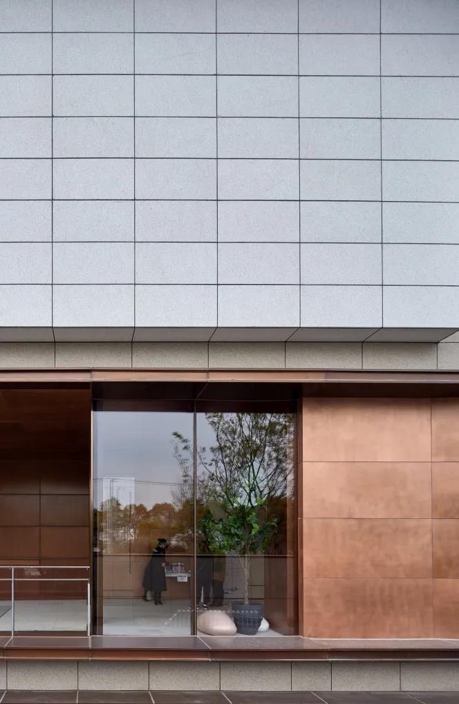 建筑形体的虚实变化间,穿插使用精致的仿铜铝板进行过渡,在每一个微小的细节都希望体现建筑应有的精致和价值感。