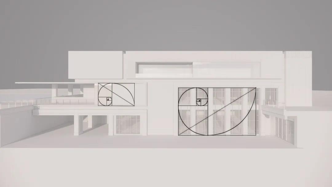 现代都市建筑的外形大都规整丰富而又别具特色。而浪漫的法式风格强调建筑的对称性与序列感。在生活馆的形体设计中,现代都市建筑的框架与法式元素叠加融合。