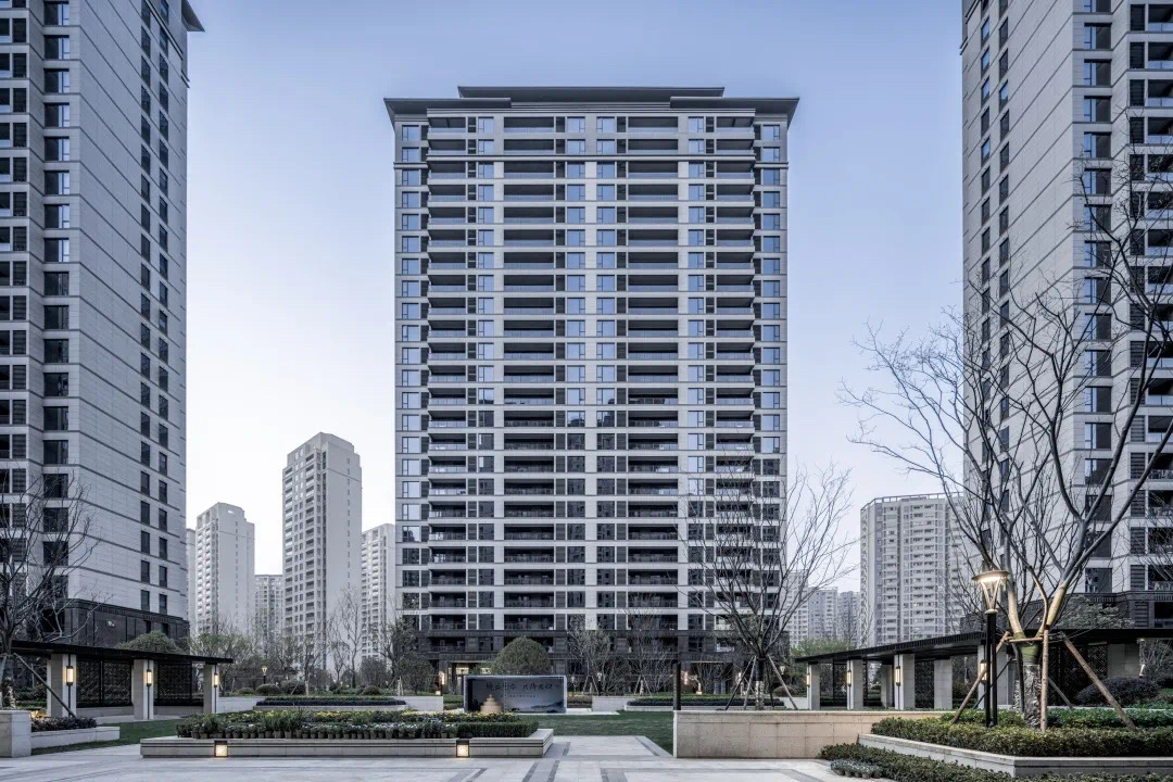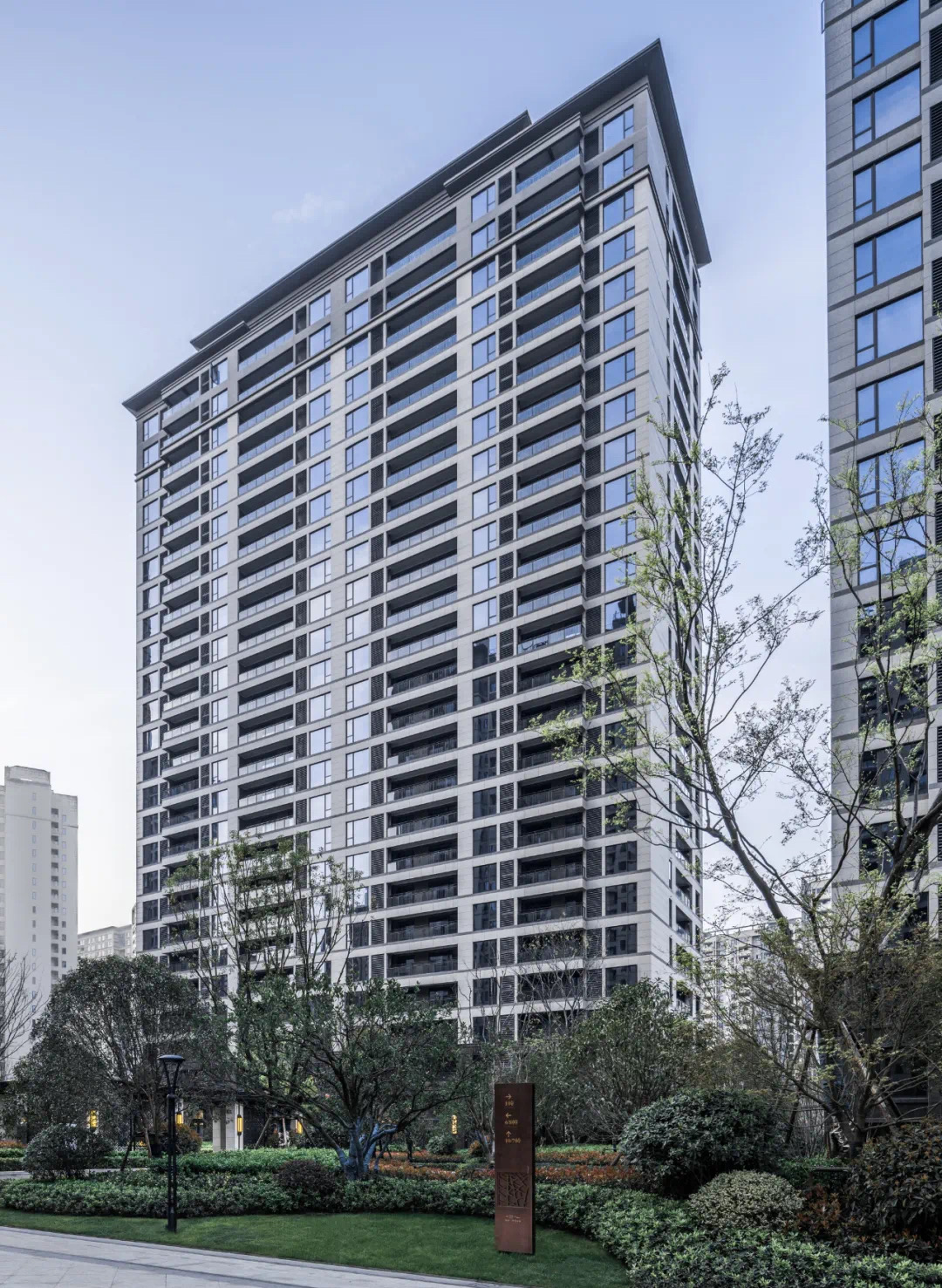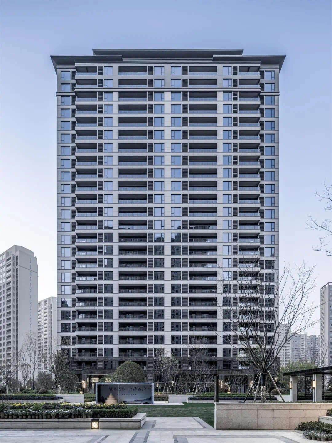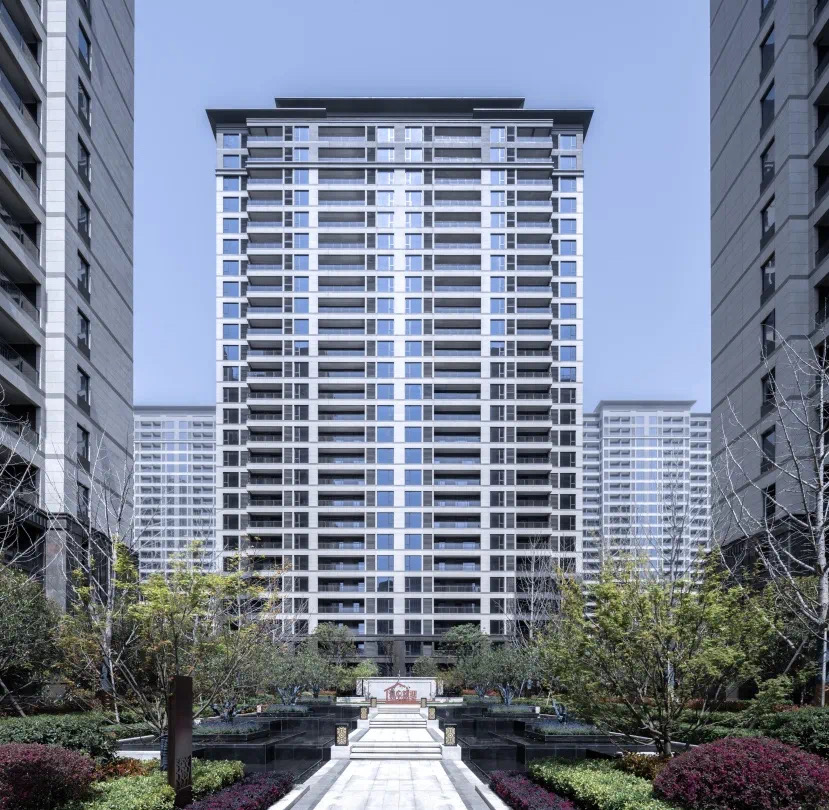 建筑立面设计借鉴新古典建筑的精致和挺拔,以基座+主体+华盖经典三段式设计为基础,汲取现代东方美学的含蓄,摈弃古典建筑繁琐的线条和细节。