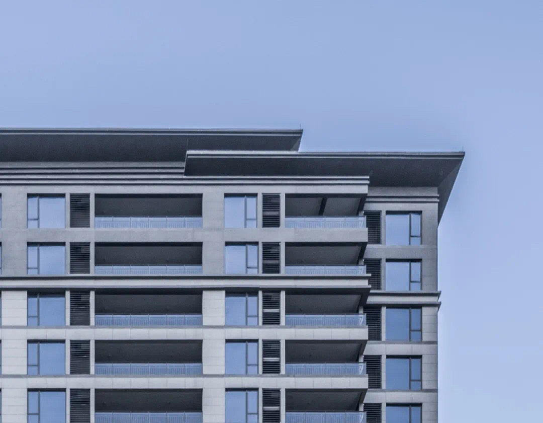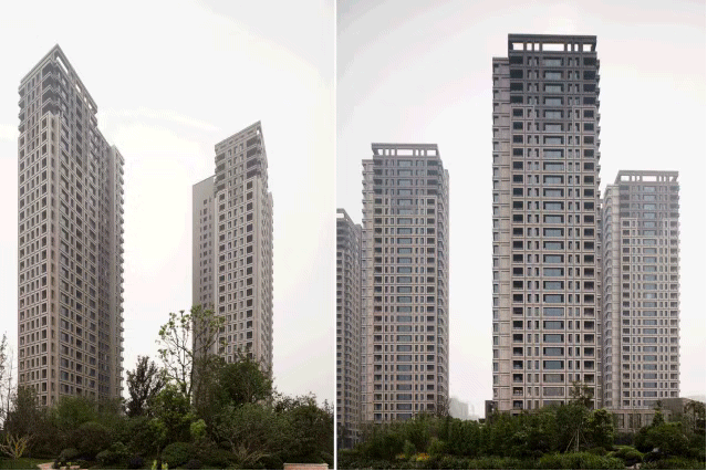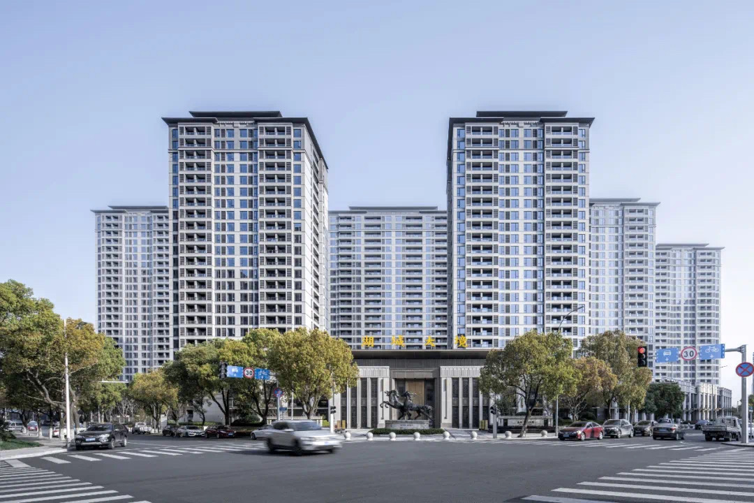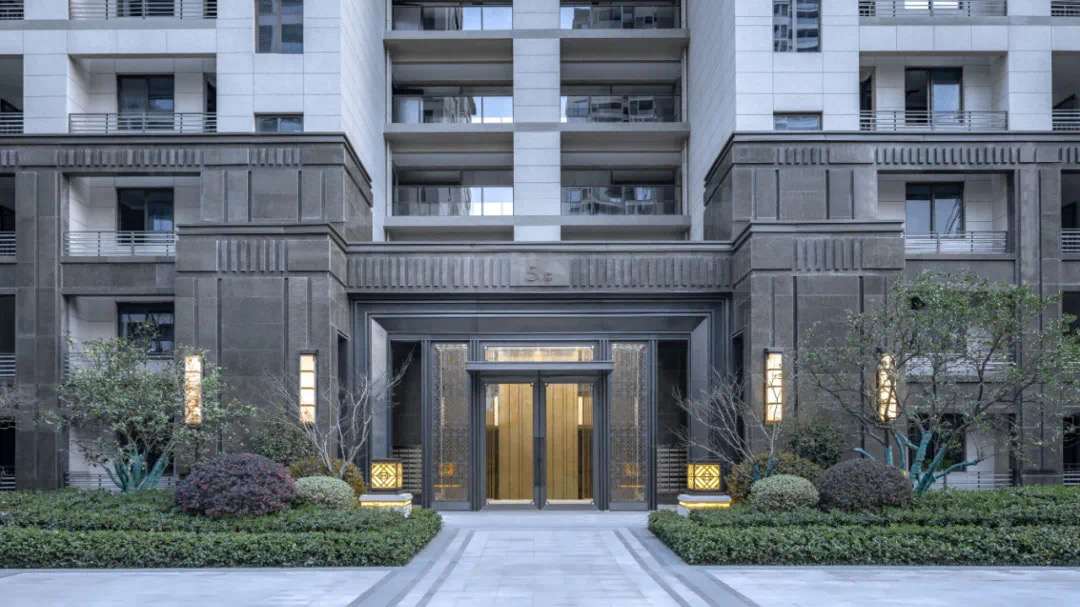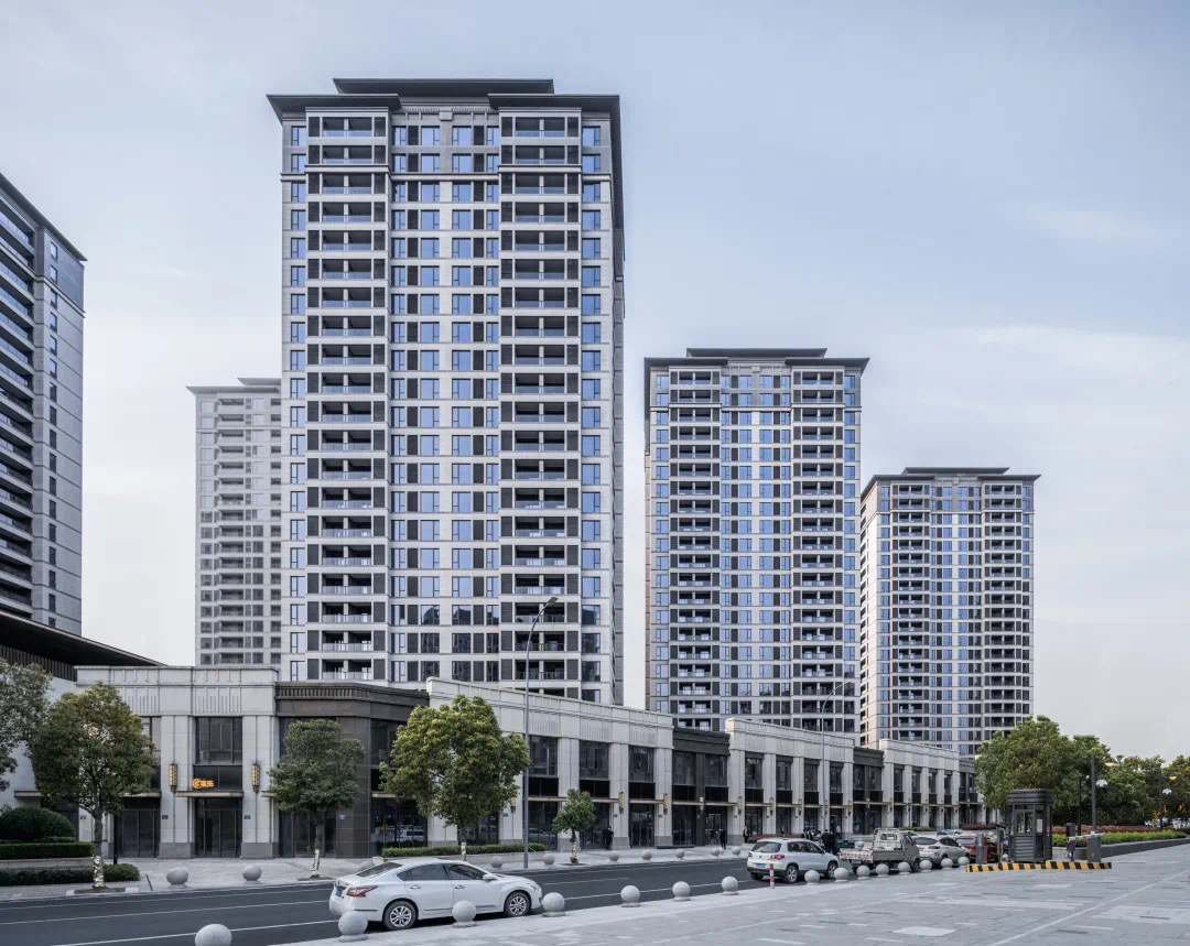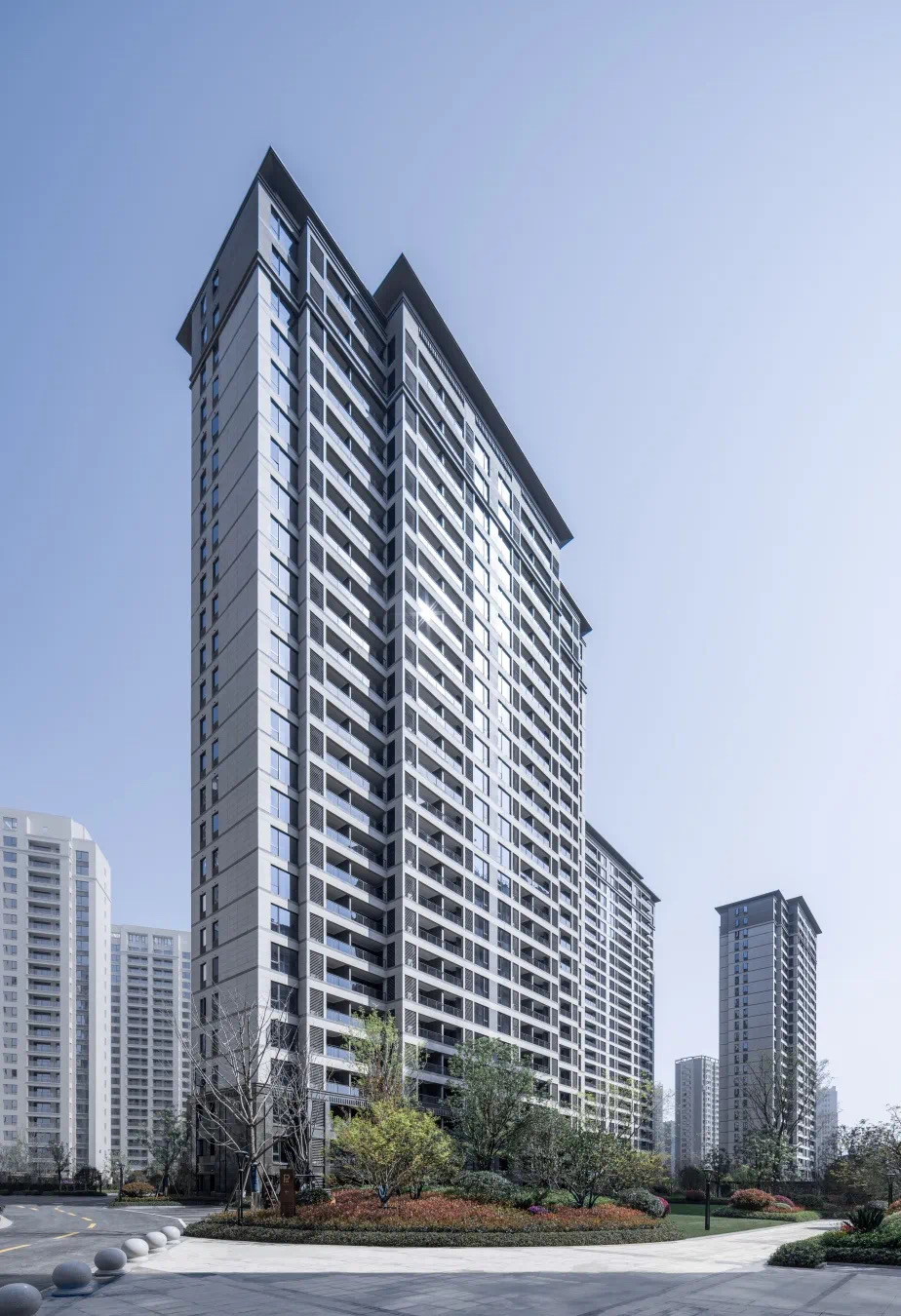 建筑立面设计借鉴新古典建筑的精致和挺拔,以基座+主体+华盖经典三段式设计为基础,汲取现代东方美学的含蓄,摈弃古典建筑繁琐的线条和细节。