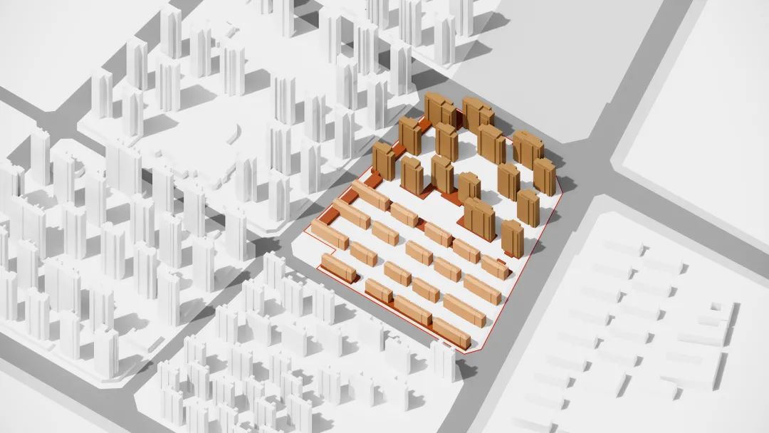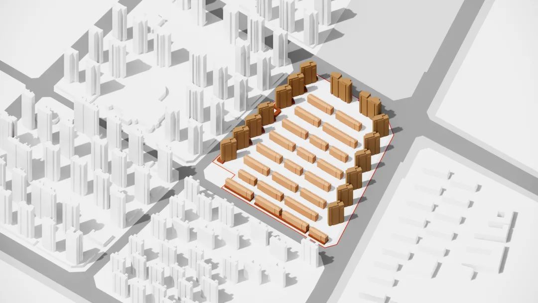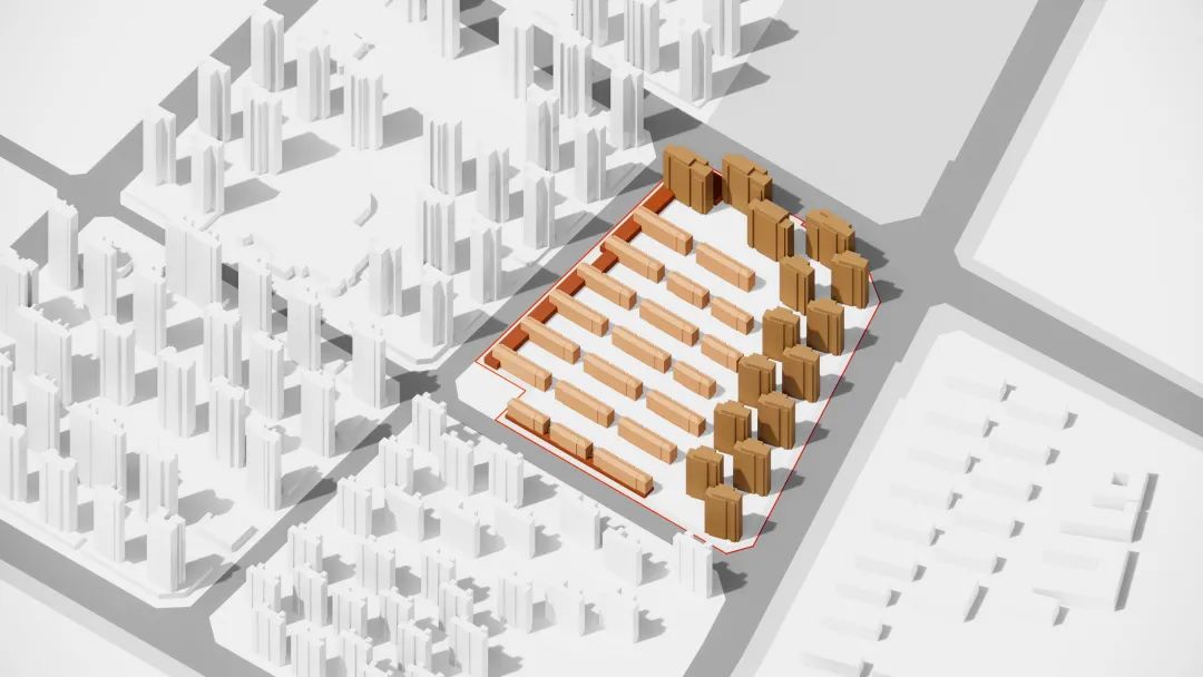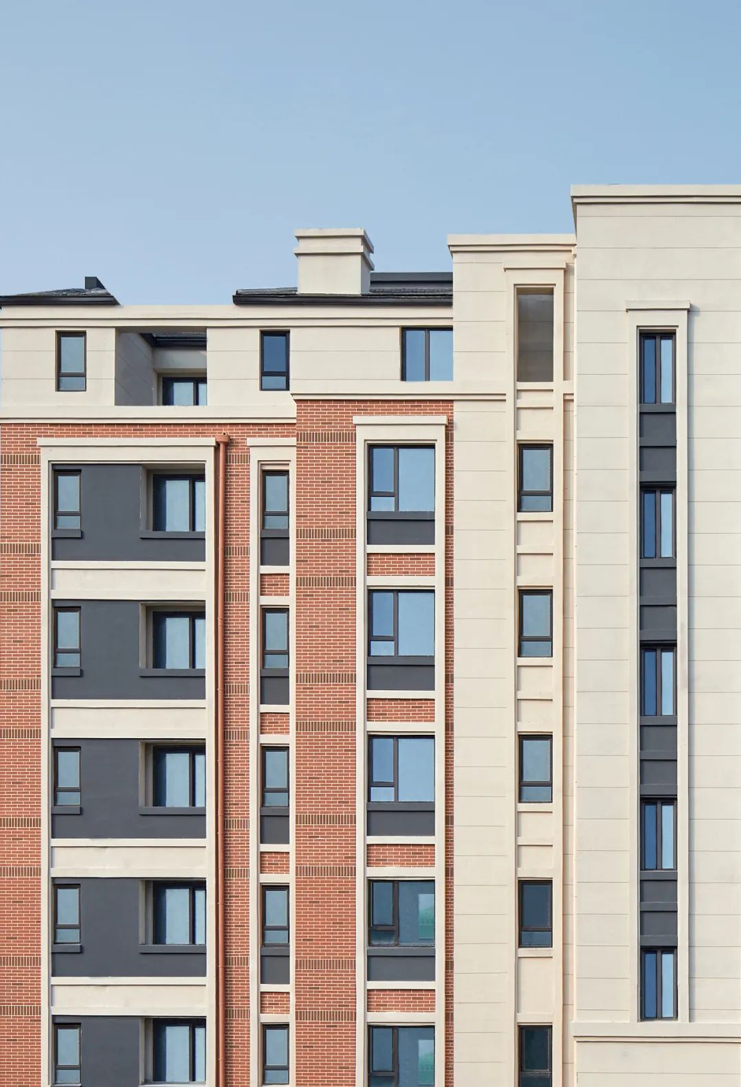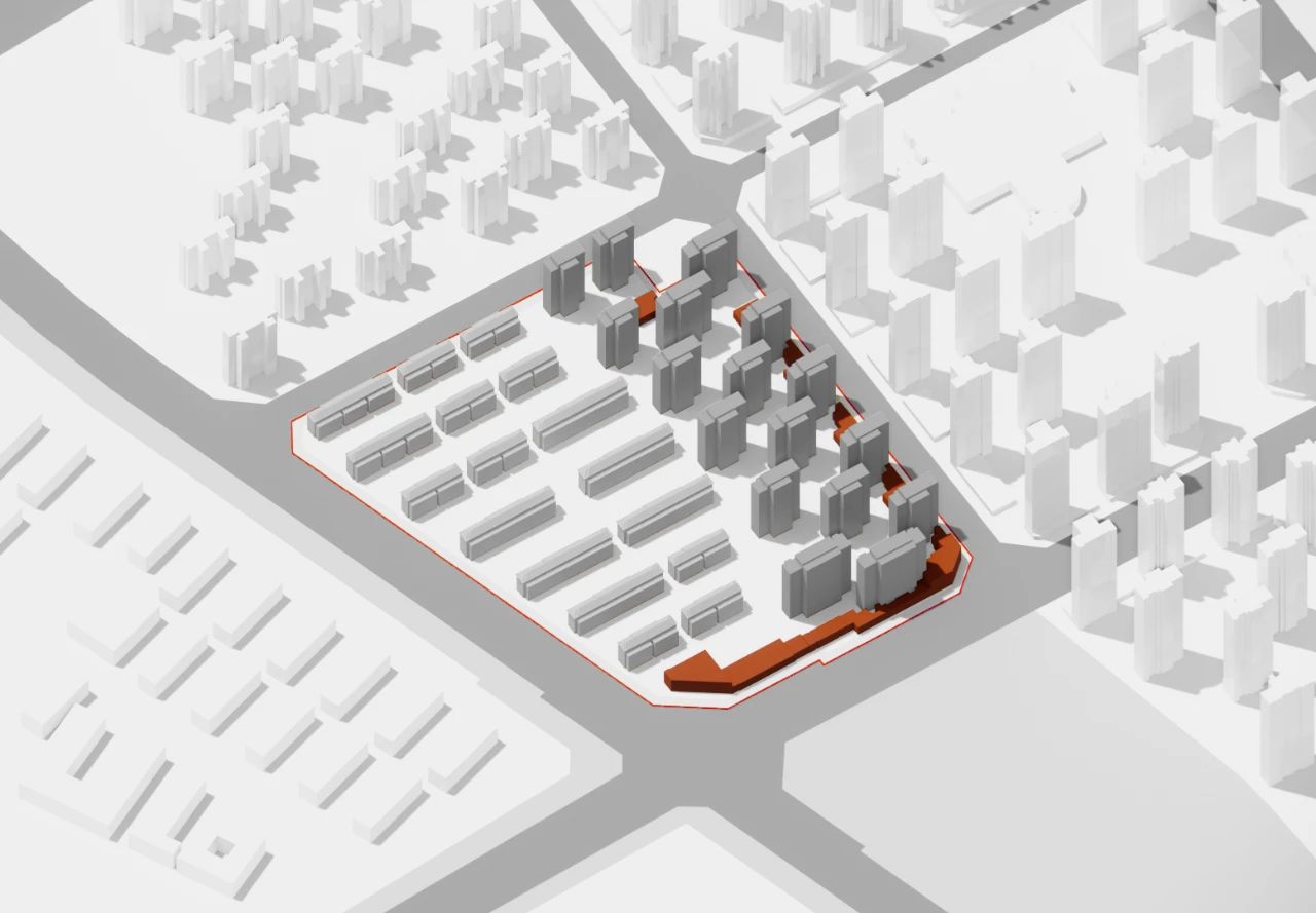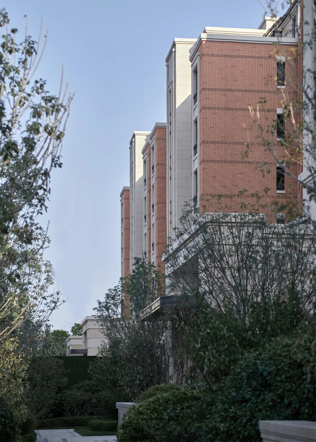 如果说园林式庭院延续了地域性特质,那么建筑立面则成为提炼文脉的重要笔触。我们希望立面的设计不仅呼应基地周边独有的红白相间的肌理表情,同时需尊重城市本土的历史轨迹,抒发居住建筑群落的真情实感。