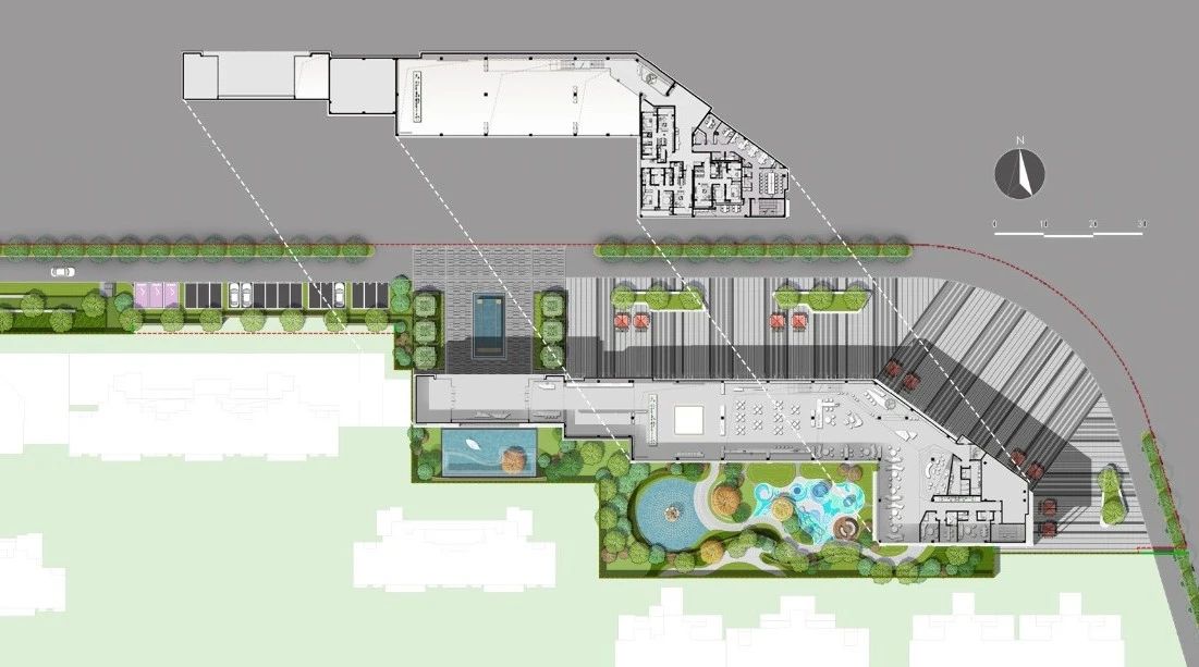 一切归家路途的源头从基地北面伊始,我们重塑社区生活场景,围绕首进主题院落,将商业街、社区入口与首栋洋房糅合作为体验式单元,模拟居者的体验动线创新社区生活的范本,既扎根于本土地域又具新时代特质。