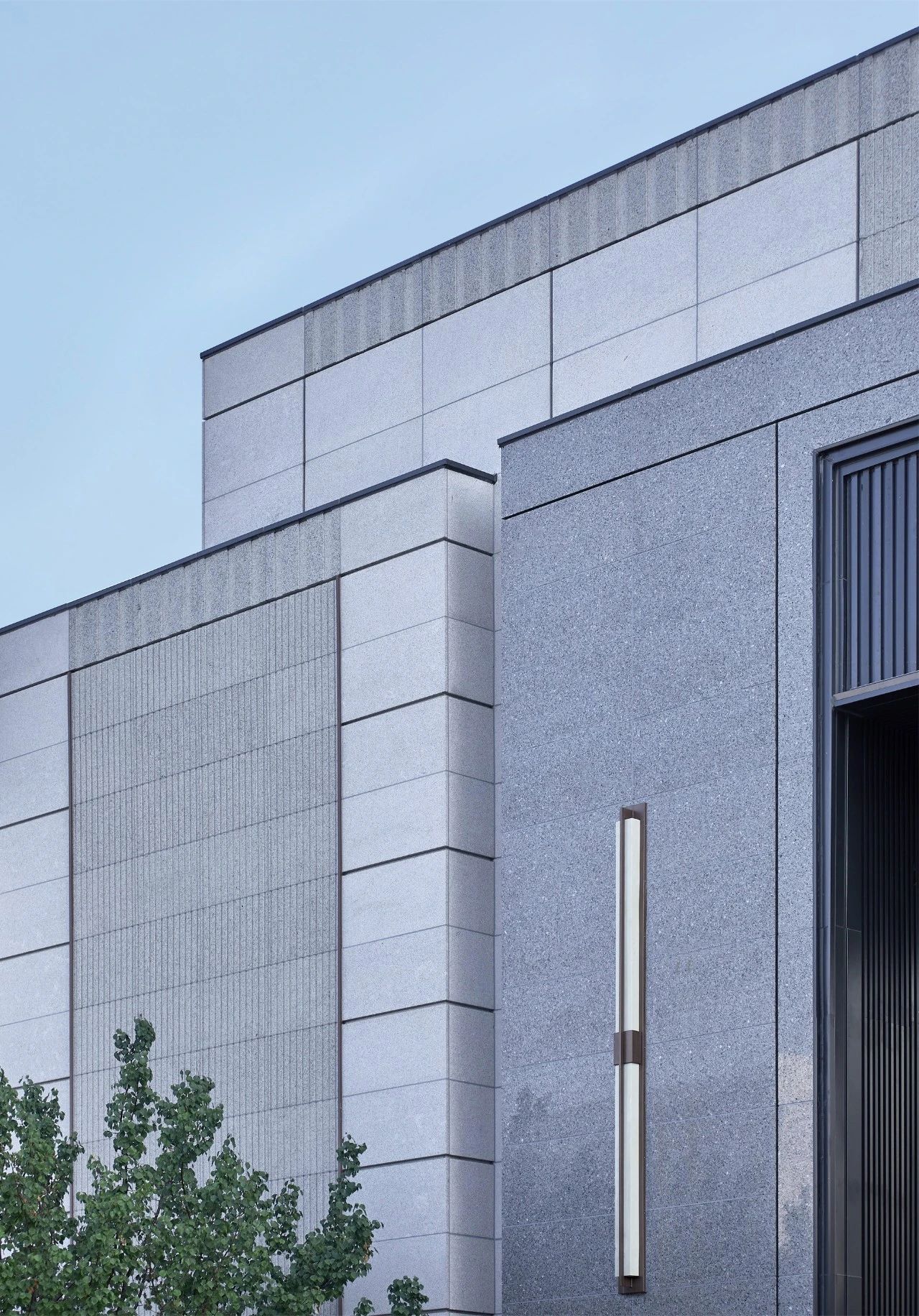从外向的城市空间进入到社区内部,入户大门的灰空间以14m宽×10.8m高的超常规尺度,营造具有仪式感的形象。灰空间的一反常态并不影响人们的感官体验,近人尺度我们采用多种不同颗粒质感的白麻石材,经过抛光、光面拉槽、密缝拼接的工艺处理,这种强烈的反差更能传递建造者的匠人情怀。
