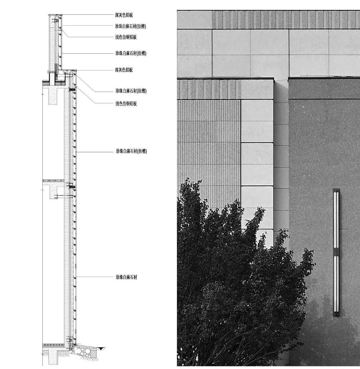 △白麻荔枝面石材与金属材质的拼接细节