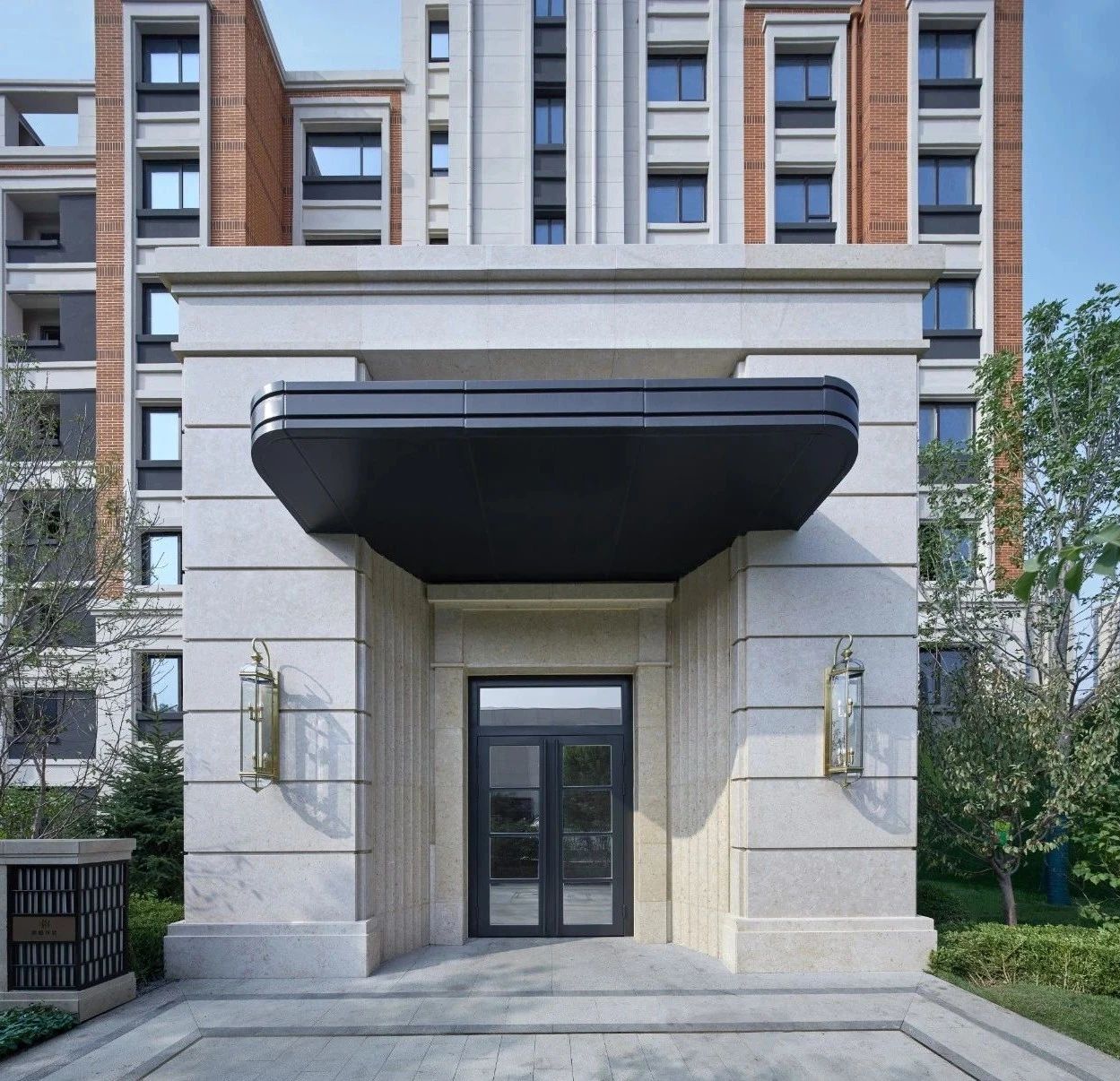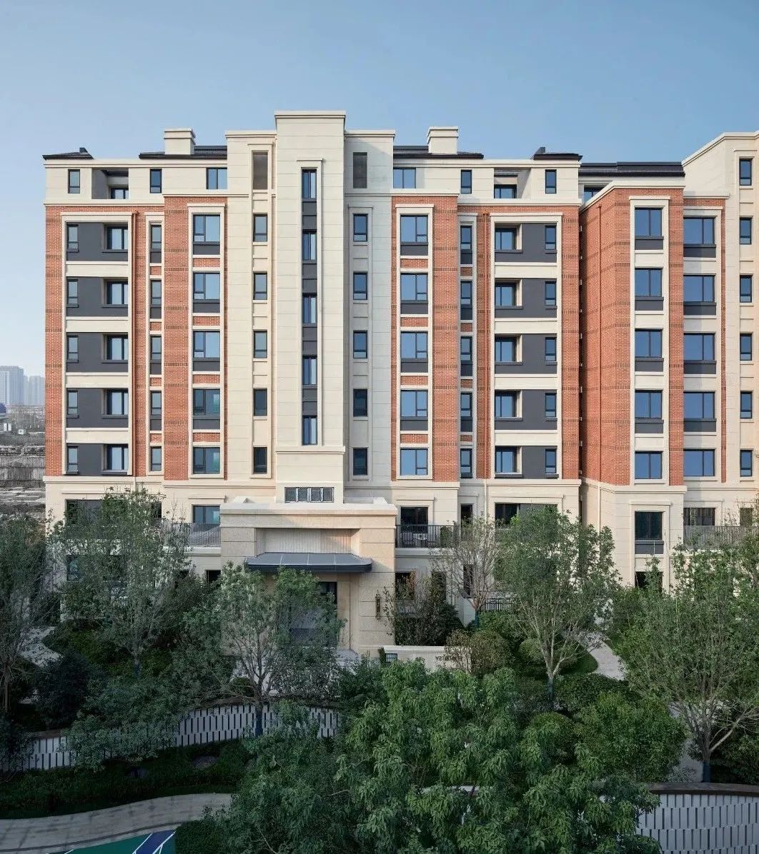 正是在这样的基因沿袭下,我们梳理基地整体的环境条件,立足于新古典学院风格,将盛京之红与书院文化紧密结合,甄选最具传统文化的建筑材料“红砖”,并搭配米白色的石材统一协调社区的建筑风格。