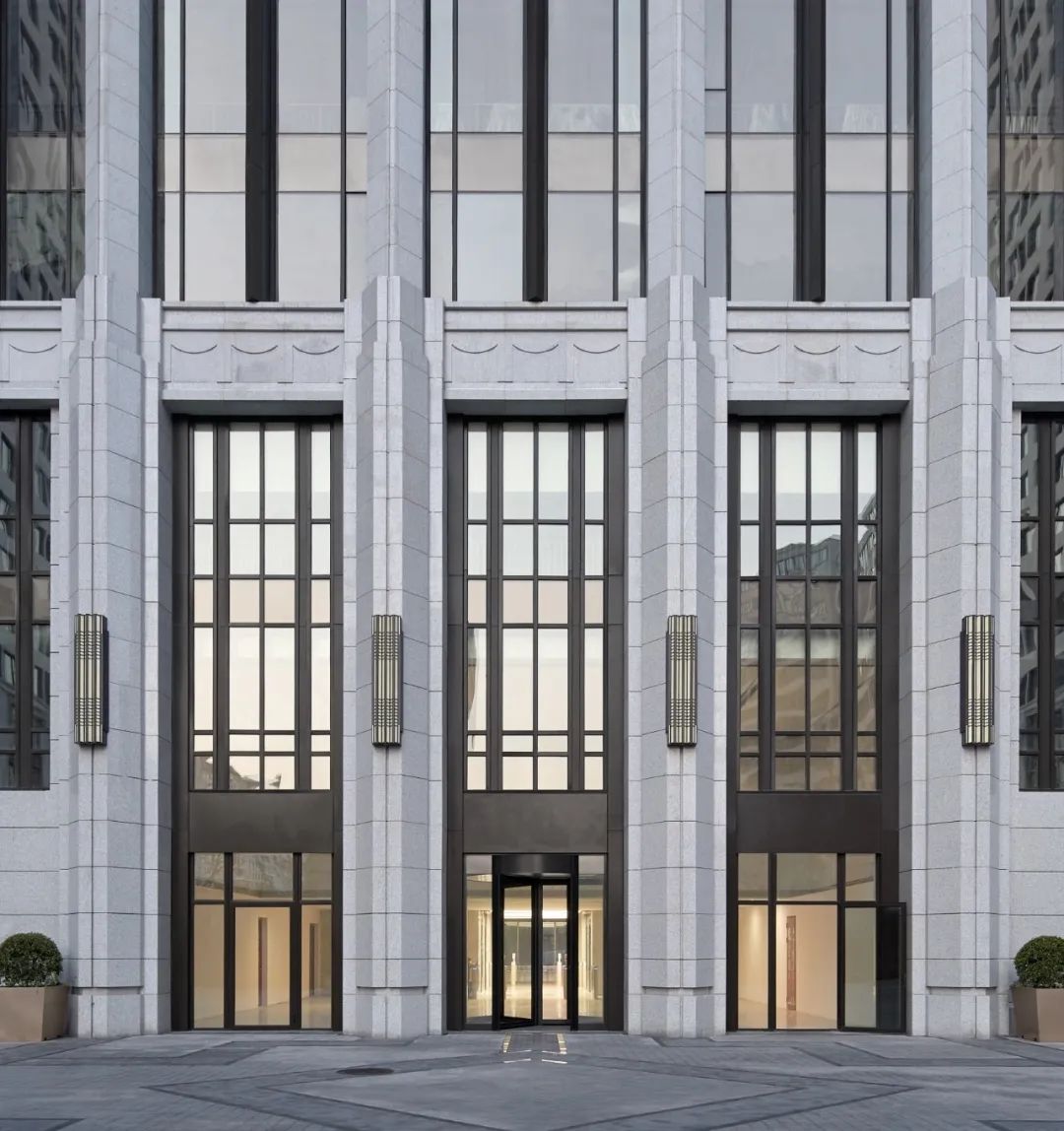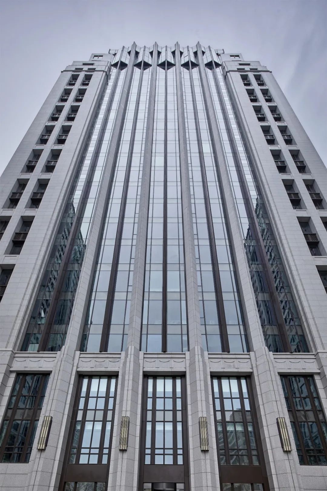 建筑主体通过现代的设计手法将古典建筑厚重典雅的体量感、三段式立面分割和中轴对称的造型手法完整的保留;玻璃与石材结合,强烈的虚实对比削弱建筑对城市街道的压迫感,内外空间映射于玻璃之上,古典风情与现代文明交相辉映。