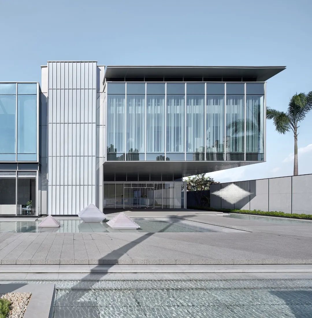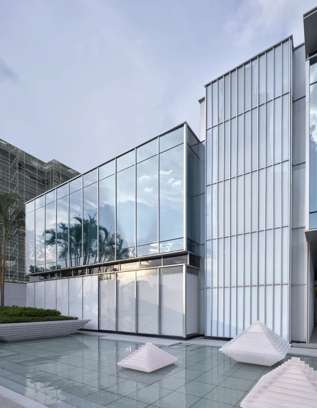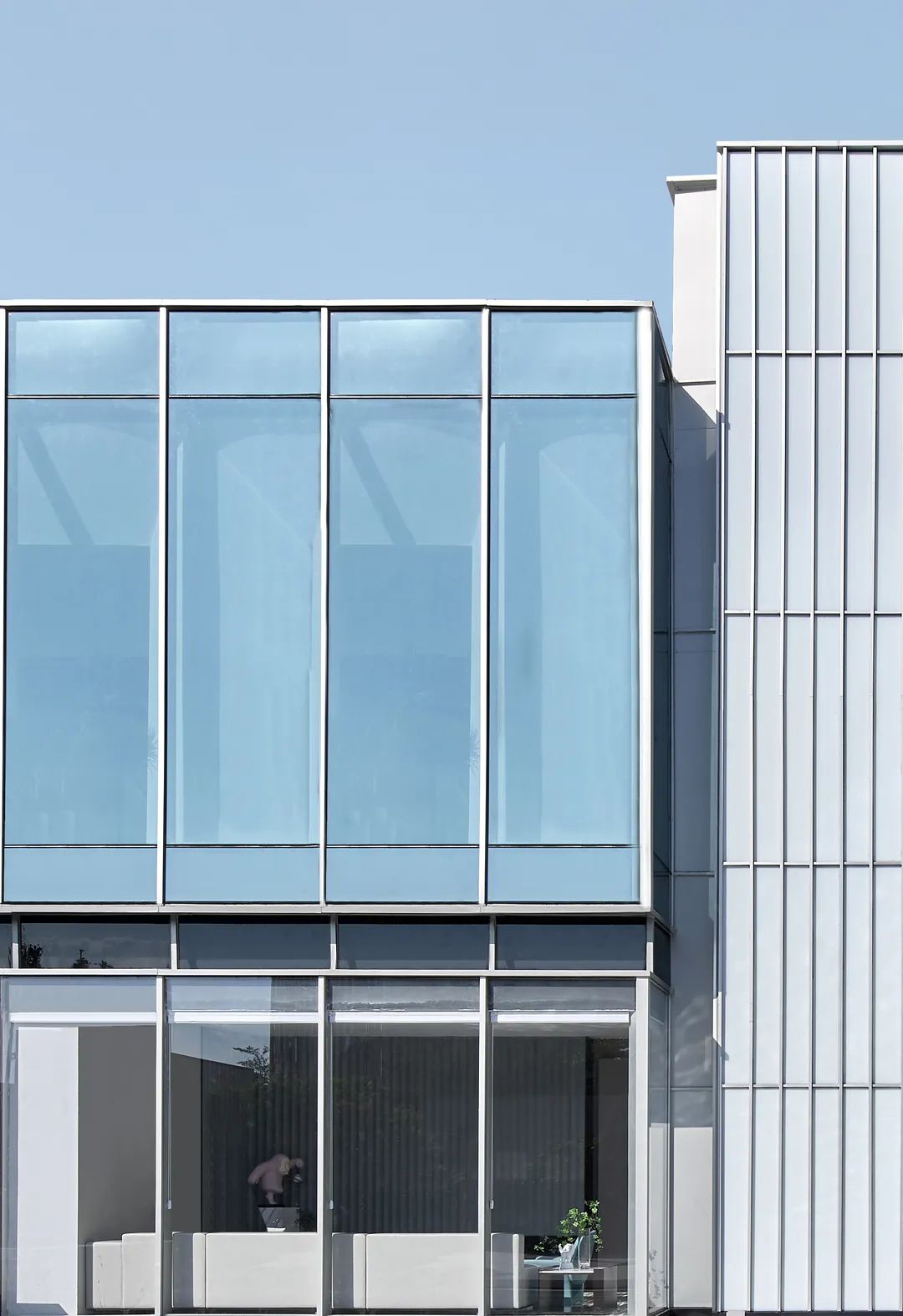 材质的甄选与立面肌理的搭配在整个生活馆的场所营造中也起到了至关重要的作用,我们运用极富现代精致感的建筑材料,茶白、蓝灰色、超白透的玻璃幕墙、银白、薄墨色的铝合金以及爵士白的大理石,在光影变化的过程中彷佛聆听了建筑与场所之间的对话。