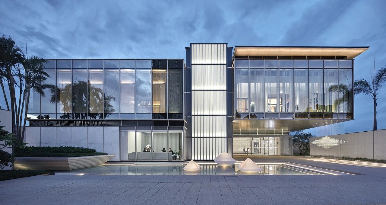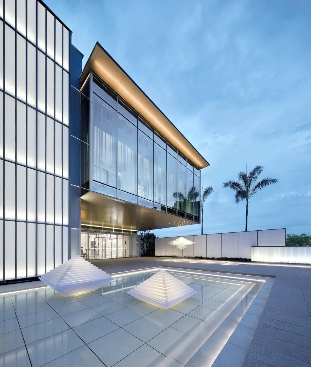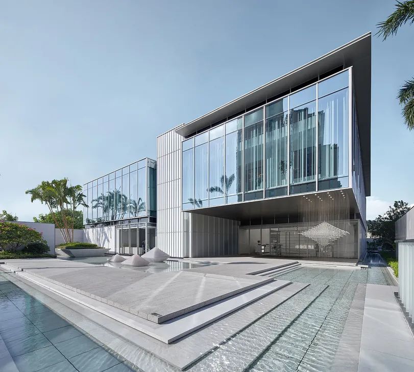 材质的甄选与立面肌理的搭配在整个生活馆的场所营造中也起到了至关重要的作用,我们运用极富现代精致感的建筑材料,茶白、蓝灰色、超白透的玻璃幕墙、银白、薄墨色的铝合金以及爵士白的大理石,在光影变化的过程中彷佛聆听了建筑与场所之间的对话。