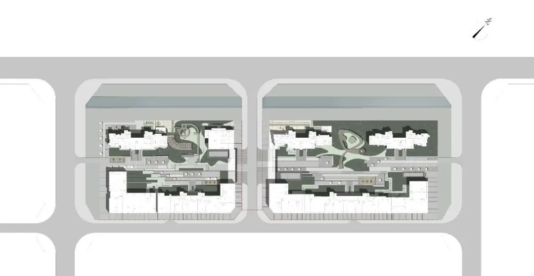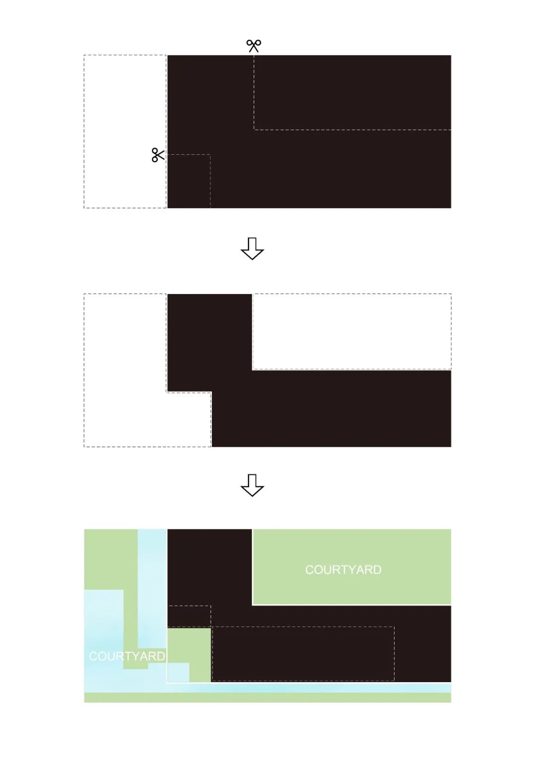 项目整体被道路分成两个地块,我们将生活馆落位于内向主干道的转角处,从建筑与环境相容的角度入手,塑造内外向空间的交织融合。