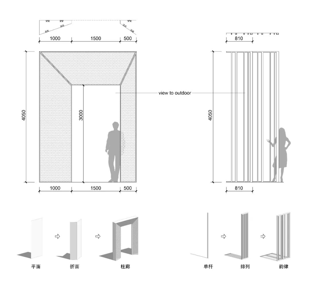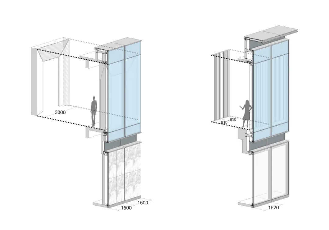 为了实现独特的效果,设计在细节方面注入巧思,仅以两种模数化体系实现多元表达,并兼顾双层肌理的统一性。其中一种玻璃幕墙以4.05m高×1.5m宽的模块化体系,搭配同样尺度的穿孔铝板,加强定位安装的弹性的同时,又避免单调乏味的立面效果。