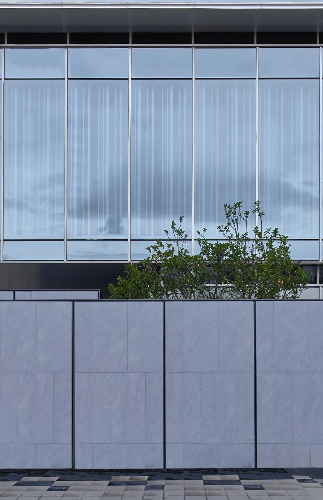 我们在立面的设计中延续建筑的渗透感,通过两层表皮肌理的交织将景观与建筑空间贯通:玻璃幕墙作为第一立面表皮,容纳简约的结构形态与纯粹的立面肌理;穿孔板与格栅以多样的韵律感,半透明的第二表皮丰富了立面整体的节奏。