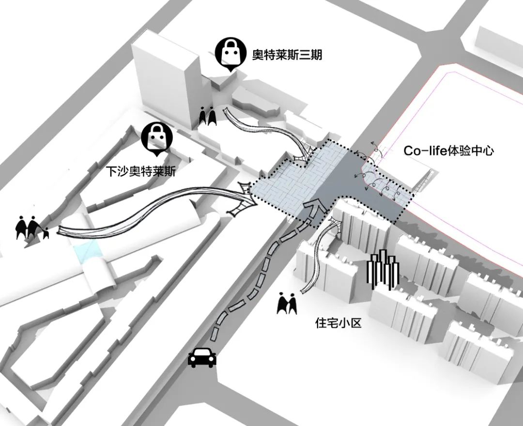为了将归家路径与休闲互动流线合理的融合,我们展开反复的磨合碰撞。经过对于周边人群使用习惯以及来往奥特莱斯的人流动线的观察研究,这片空间无疑成为链接人群与空间的绝佳选择。从饭后闲散、休憩互动、销售展示到未来归家必经之路,人们将在这座城市共享客厅中衍生更多生动场景。
