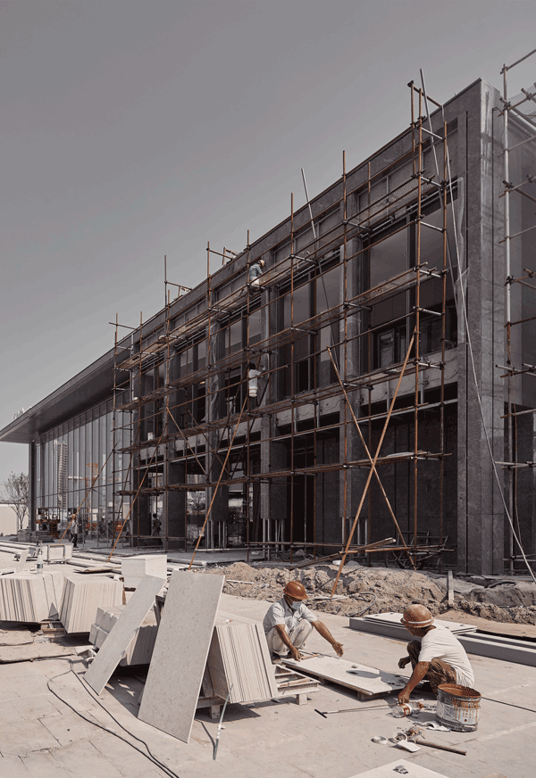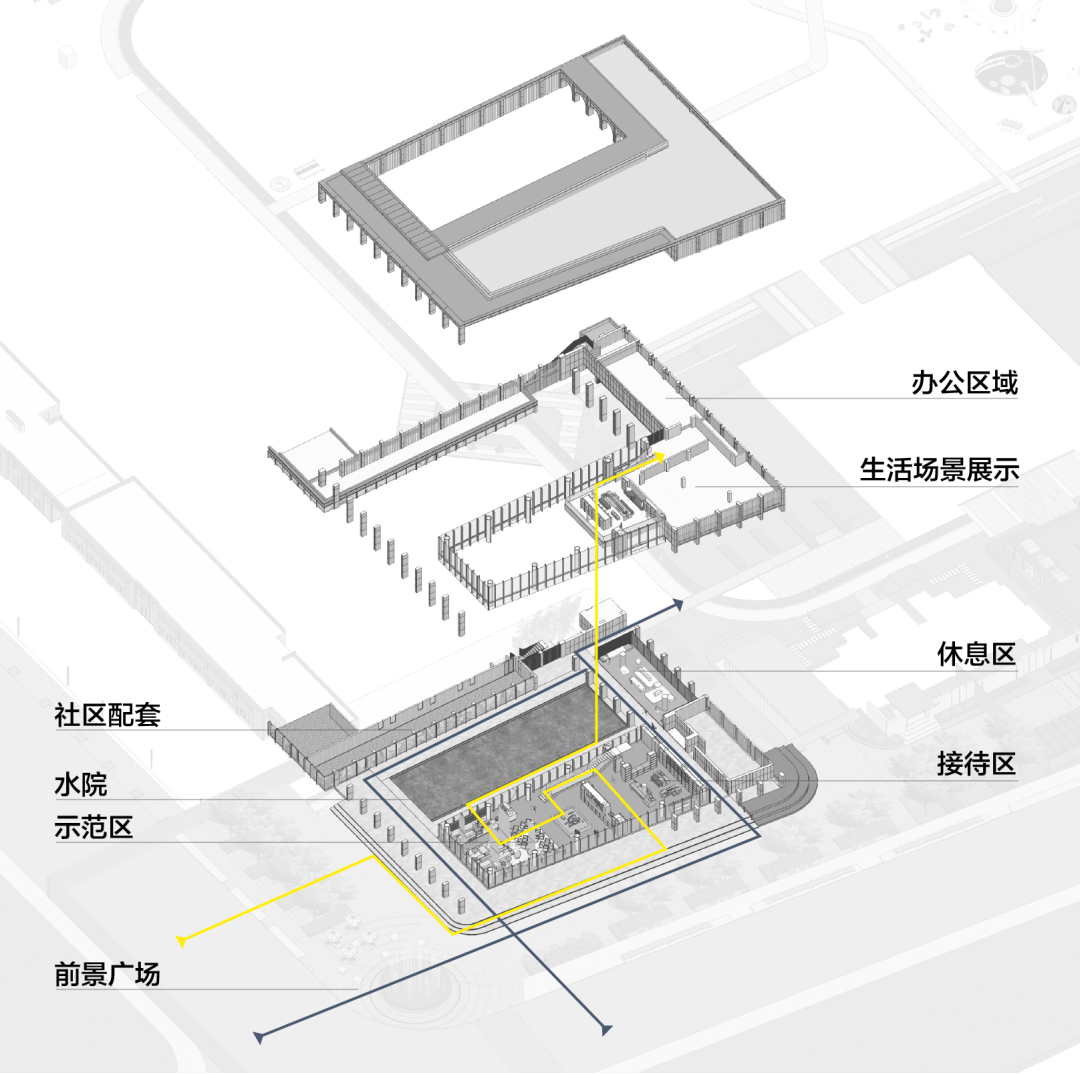 伴随多方的不断参与磨合,我们的设计思路也在不断被打破,最终形成了一个共同的关注点:人们的行为不仅贯穿于整个片区,也应该自然过渡到示范区的空间中,内与外的明确界限逐渐消失。这里更向城市界面打开,我们开始造景而非单纯的建造一座建筑。
