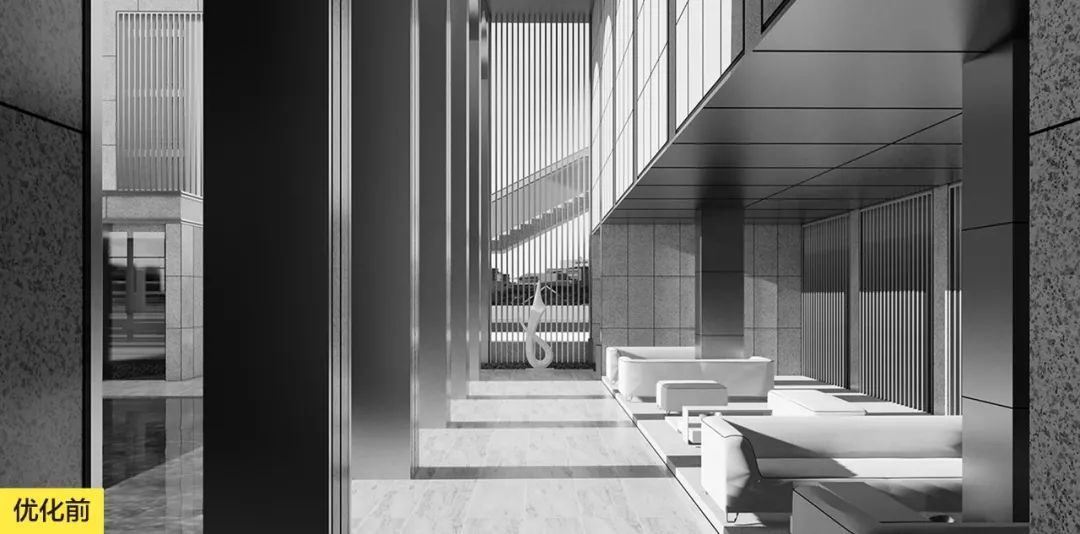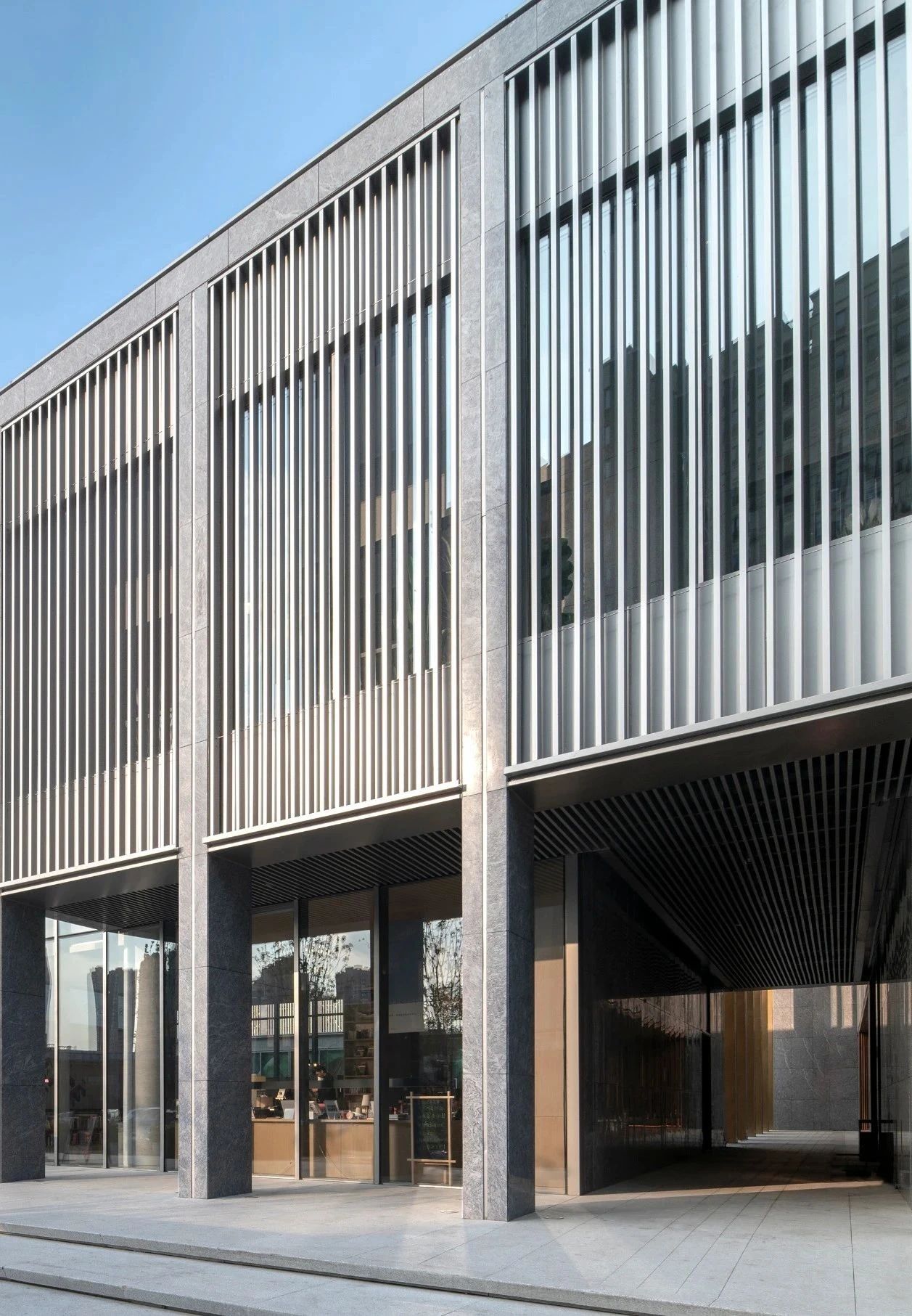 整座建筑中有很多处细节的设计考验,其中颠覆过最多次的便是幕墙细节:最初设计的玻璃尺寸横向四等分、纵向两块,造成了玻璃尺寸超规格,针对比例协调性,我们经过多次修改推敲改为横向五等分、纵向三块,分别与一二层吊顶对齐,分隔形式更合理,提升美感度。