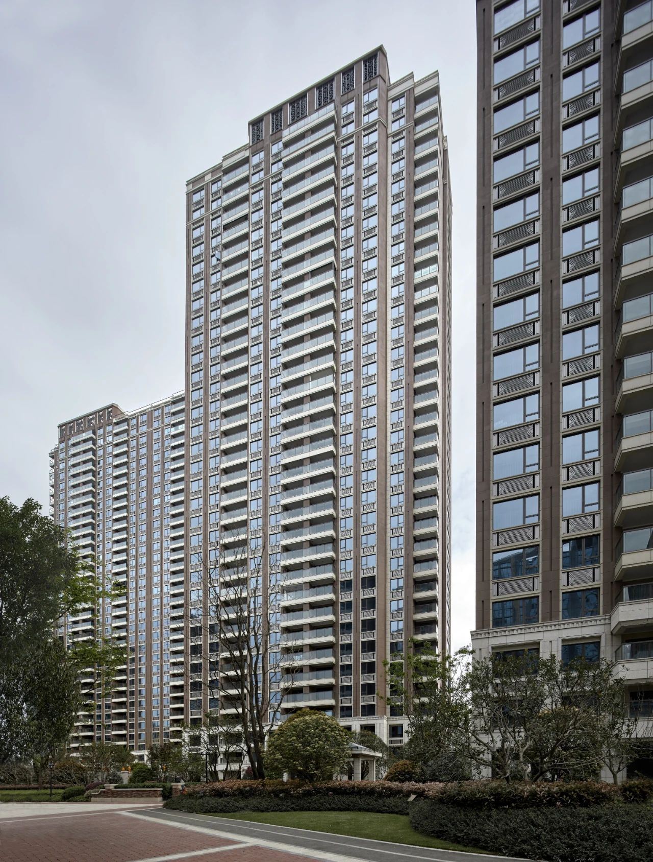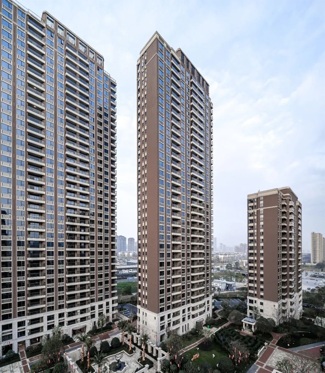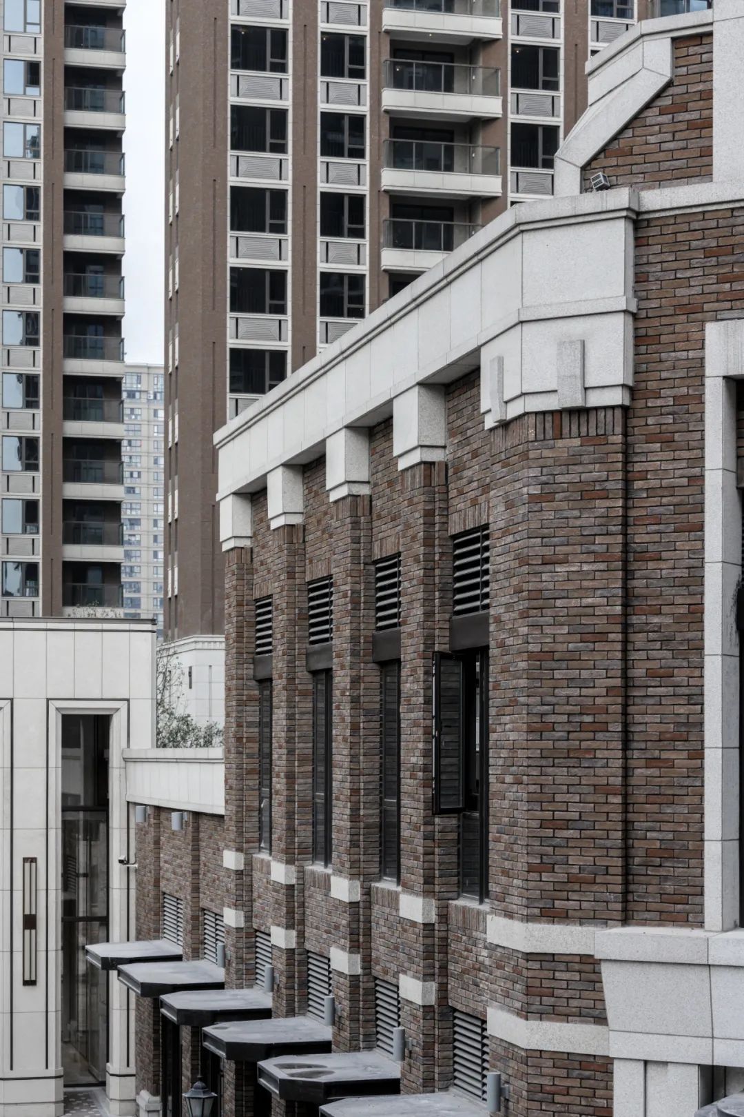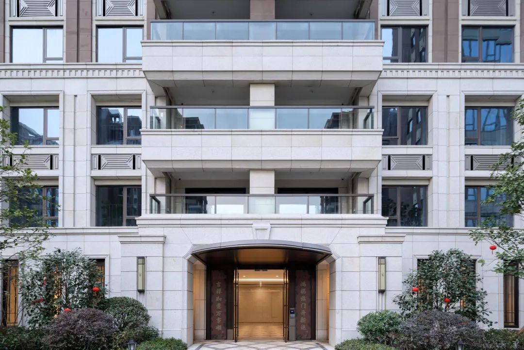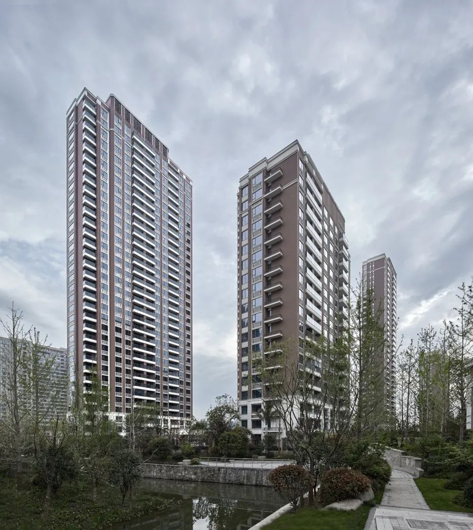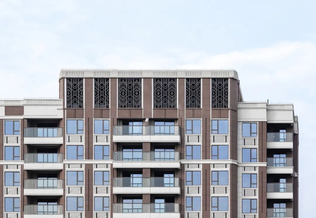 作为杭州市首座褐石系列作品,金湖艺境城承袭了美式褐石街区的经典元素与技艺精髓。设计团队在此基础上,试图突破褐石风格对建筑层高的限制,开创高层褐石建筑立面风格,以强烈的辨识度凸显居住社区美好的环境氛围。