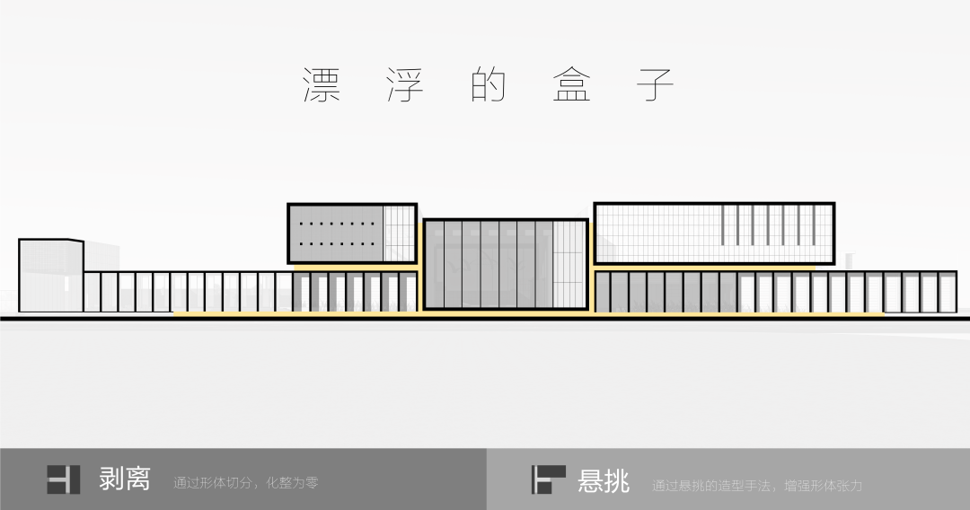 设计将功能盒子横向切分,通过体块切分、化零为整,首层架空回廊、二层局部悬挑铺垫漂浮感,形体的错动程度与结构骨架的支撑度相契合,最大限度地融汇建筑艺术性与学科严谨度。